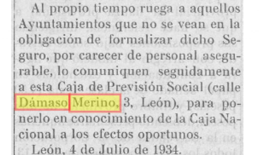 4 de Julio de 1934. Al propio tiempo se ruega a aquellos Ayuntamientos no se vean en la obligación de formalizar dicho Seguro, por carecer de personal asegurable, lo comuniquen seguidamente en la Caja de Previsión Social (calle Dámaso Merino, 3, León).
