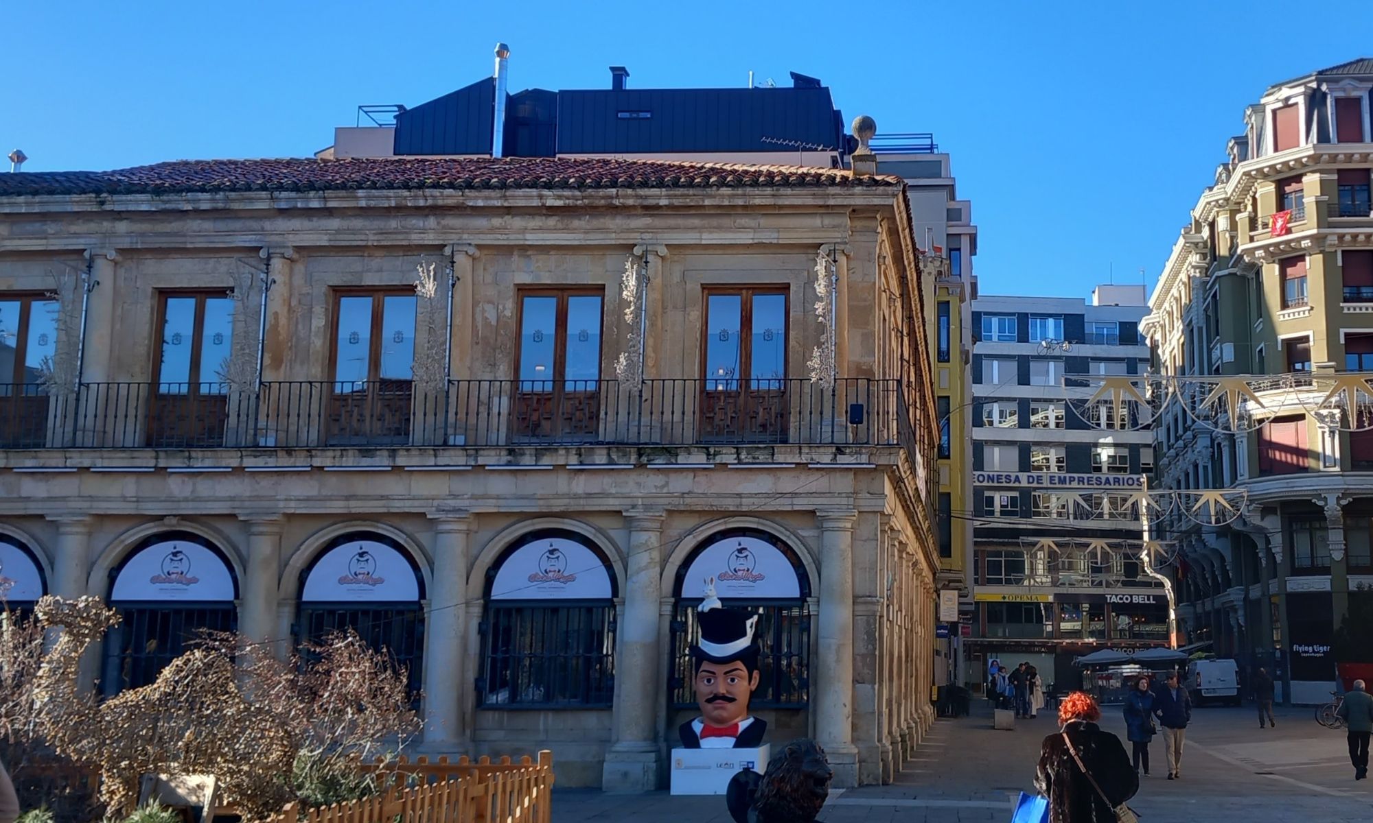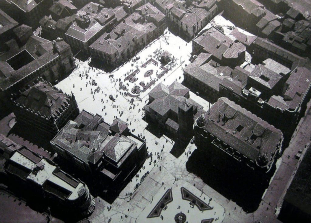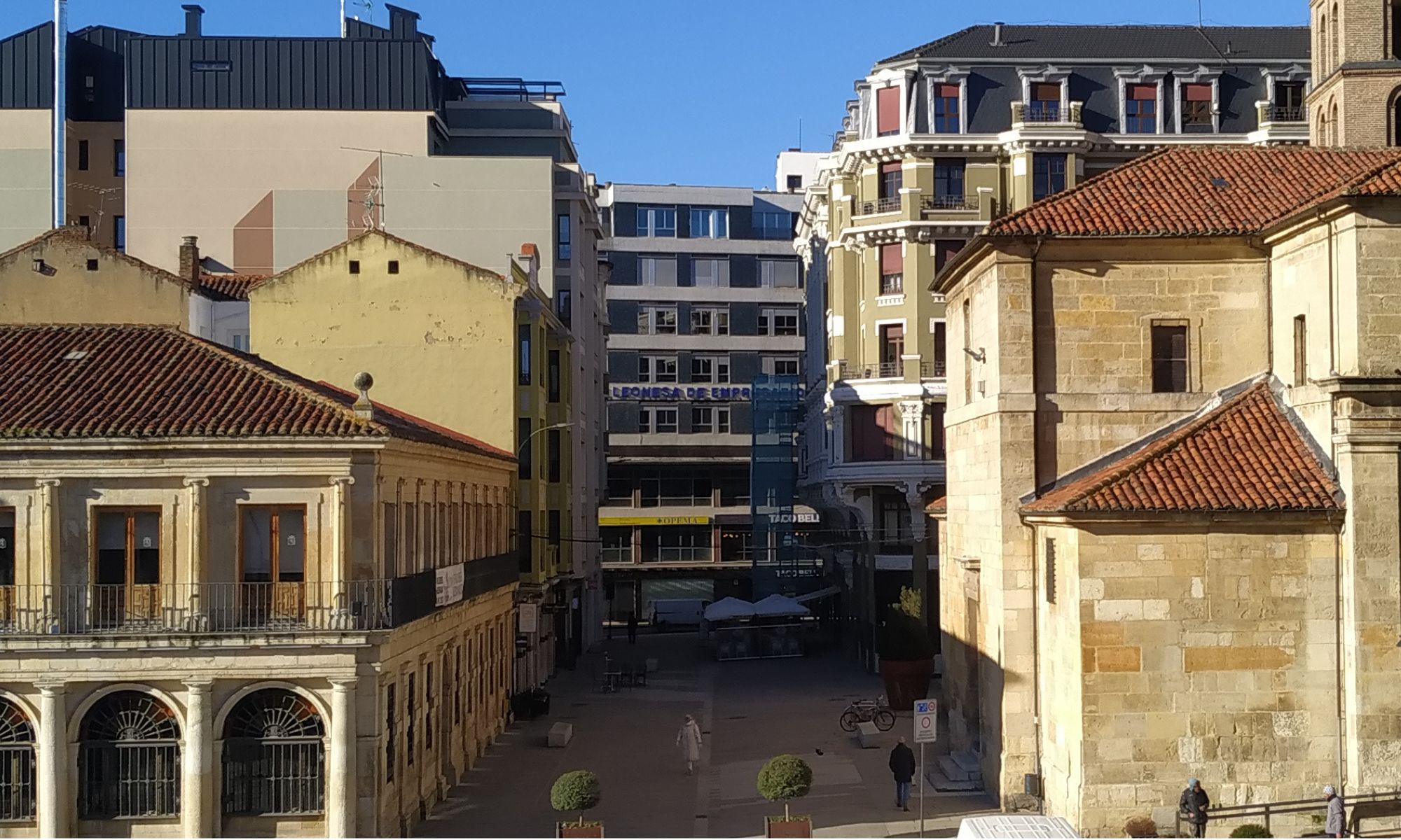 Ha sido testigo del cambio que ha sufrido León, y de cómo sus edificios han evolucionado. Como observamos en la imagen, el torreón del Palacio de los Guzmanes aún se hallaba derruido, y hoy goza de un gran esplendor.