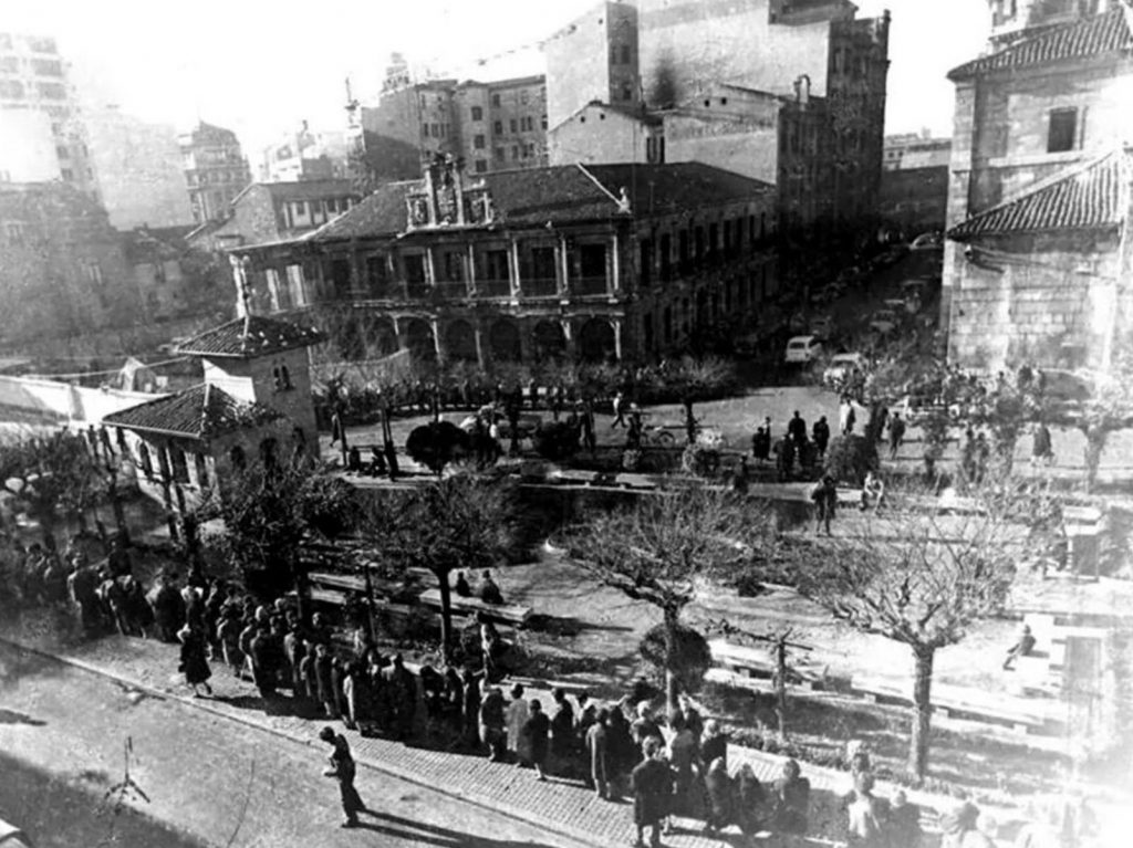 En esta vista de pájaro, a la que nos asomamos gracias a los aviadores que con pleitesía pretendían descubrir León, observamos las calles ya transitadas y la disposición de unos edificios que cada vez pretendían alcanzar cotas más altas. Llama nuestra atención la plaza de San Marcelo, que cuenta aún con la Mezquita BeniMea, de la que ya hemos hablado en otros artículos, y que fue demolida a principios de los años 70.