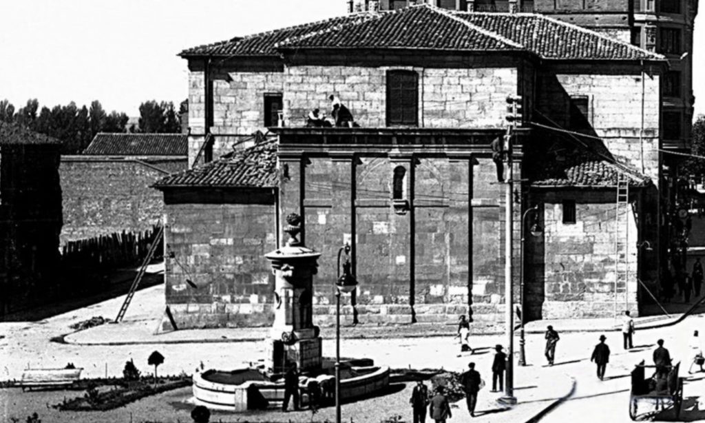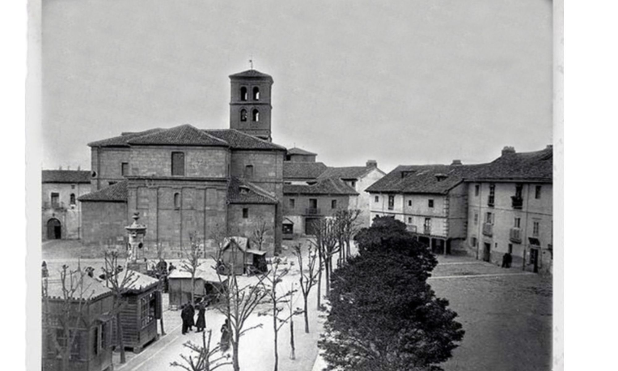 Si observan con detenimiento, pueden reconocer la fachada desaparecida del Hospital de San Antonio Abad, y, a la derecha, la imagen de las escaleras laterales de la parroquia de San Marcelo, aún en pie. En ellas, descansan dos jóvenes, que seguramente hubieran acudido a jugar a aquella despoblada plaza de las palomas.