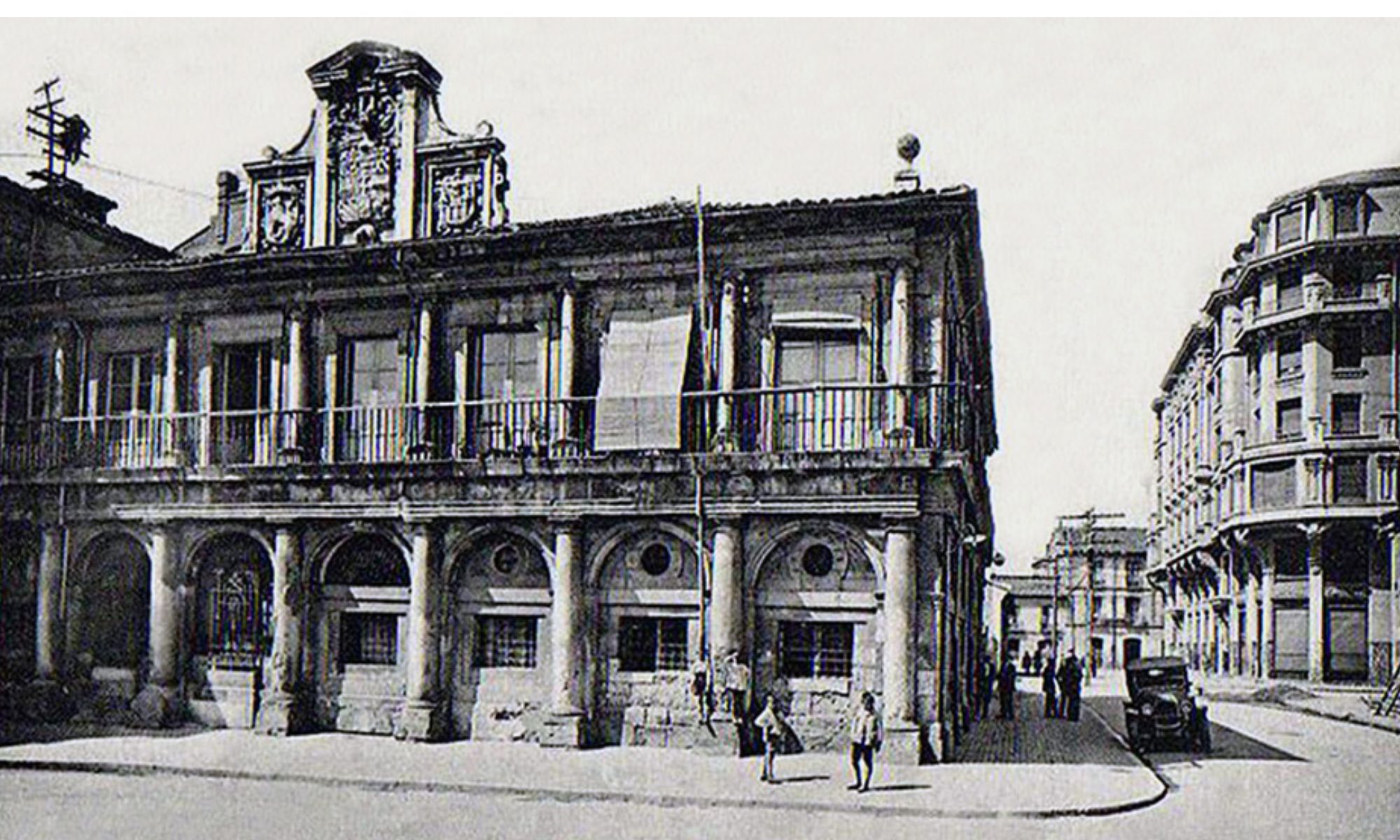 Pero no es ello lo que nos ocupa hoy. No es la iglesia la que es protagonista de nuestros artículos, sino la calle aledaña a ella. En ambas fotografías podemos observar la calle Legión VII ocupada por la entonces fachada del Hospital San Antonio Abad.