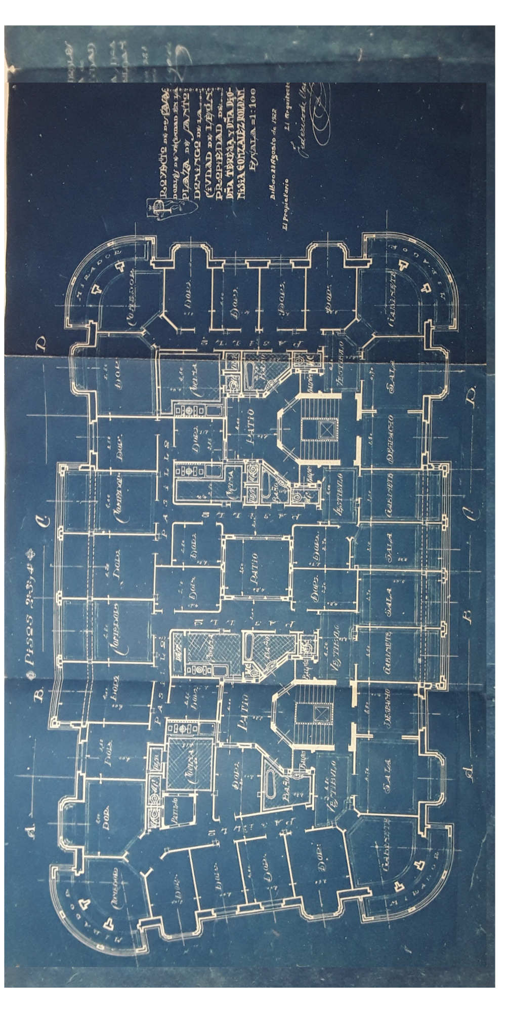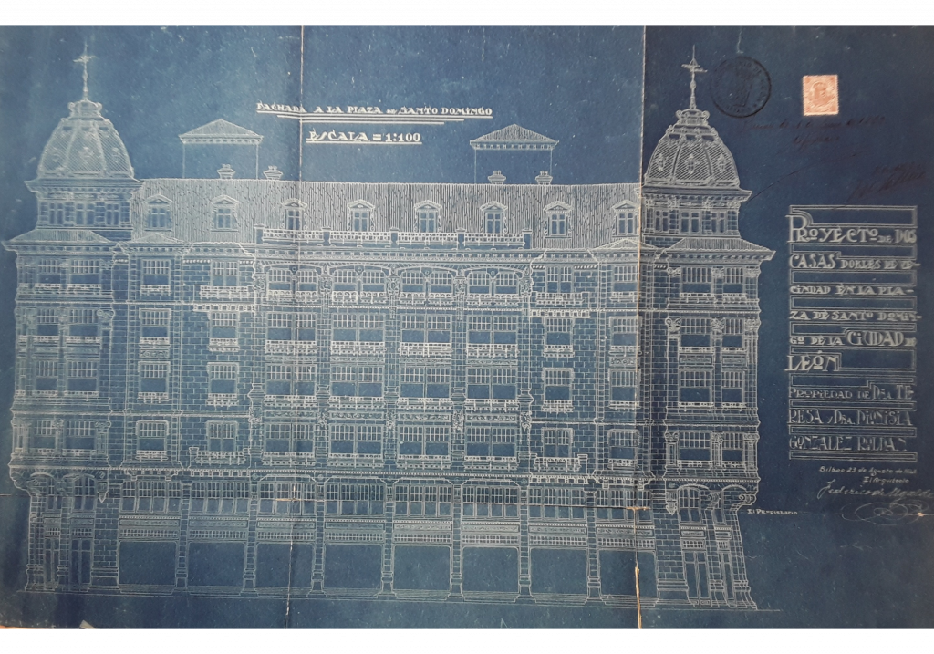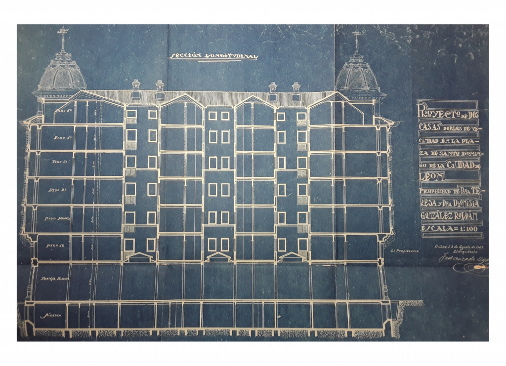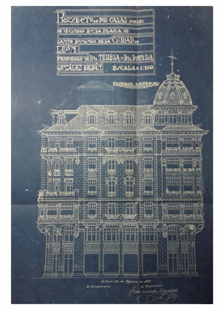 Otras, como la colindante con Independencia y plaza de Santo Domingo, es utilizada para edificar un gigantesco rascacielos (para la época, claro está) que utilizará su planta baja como almacenes. En este documento, fechado en 1923, la familia (en concreto las hermanas Dionisia y Teresa) González Roldán, comunican al ayuntamiento que la construcción del Edificio será encargada al arquitecto Federico de Ugalde Echevarría y que, con presteza, comenzarán las obras para dotar a la plaza de Santo Domingo de un eterno bastión que será su representativo símbolo durante cien años.