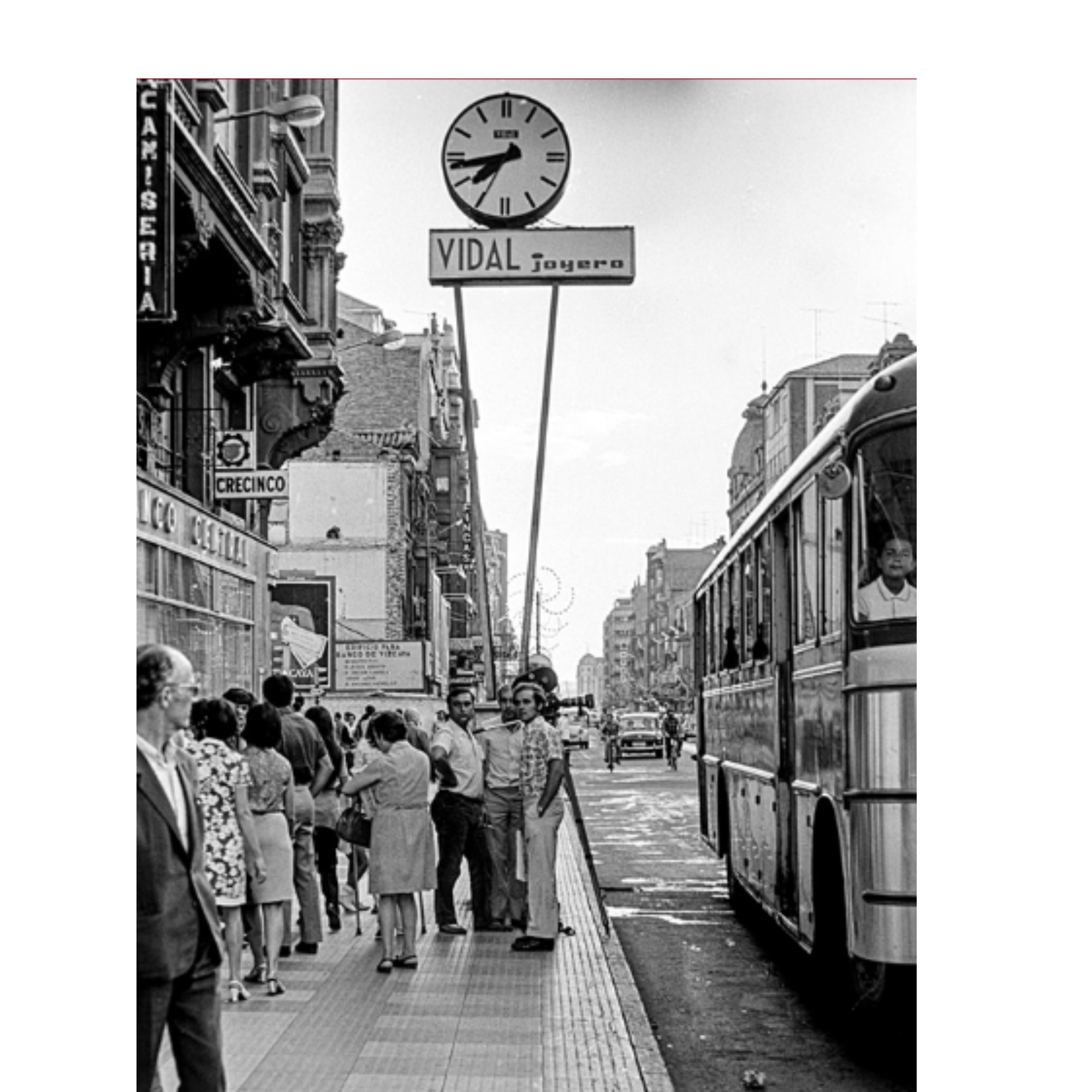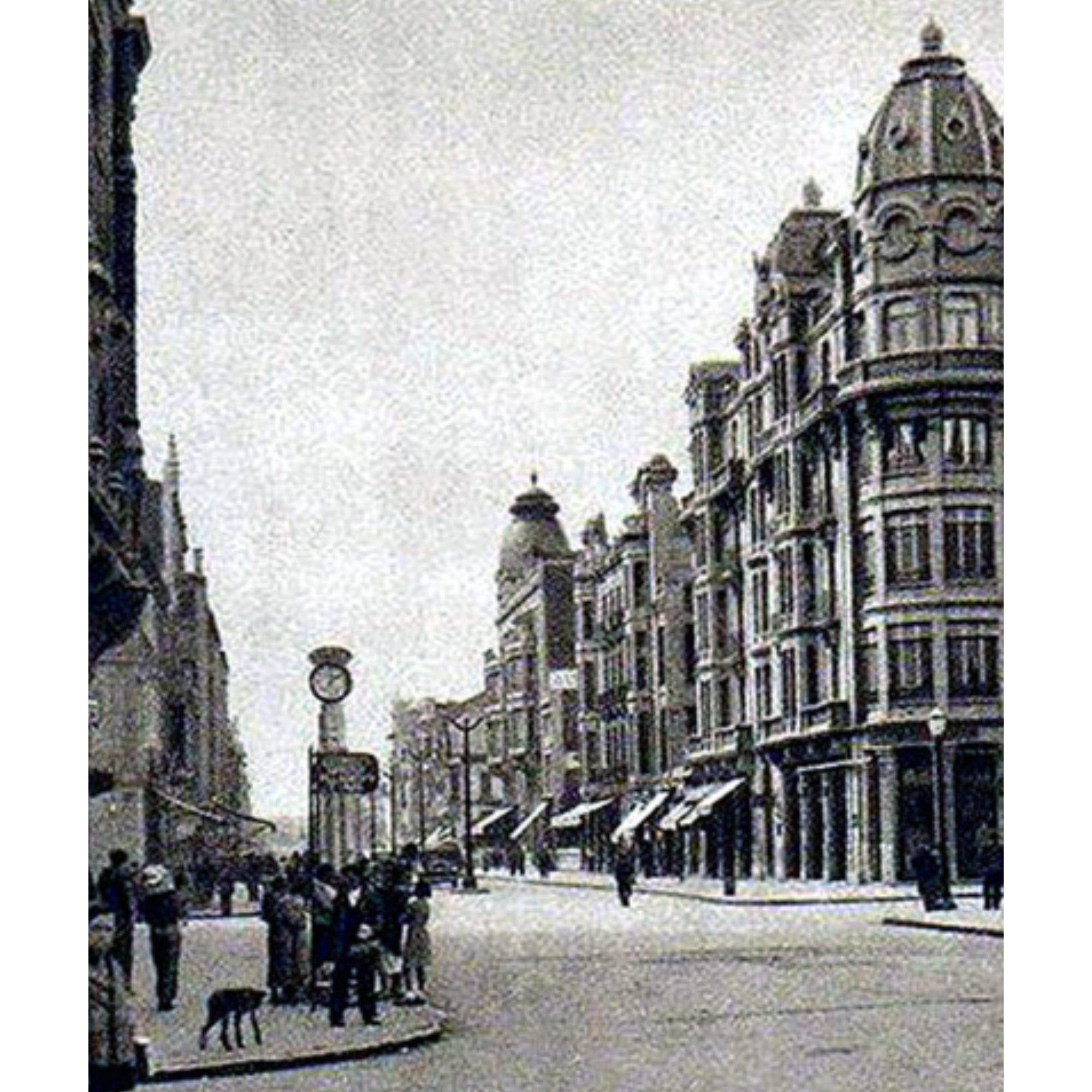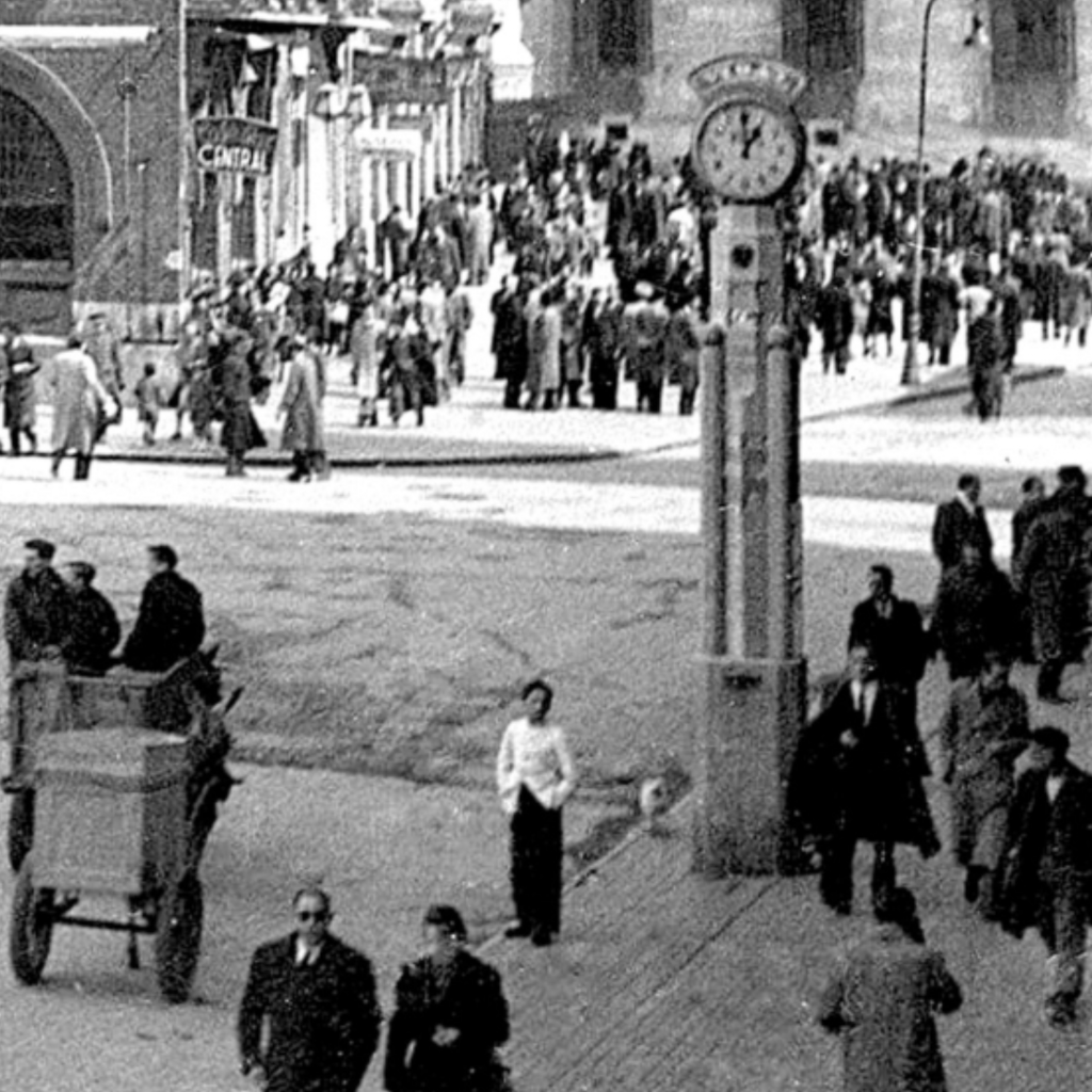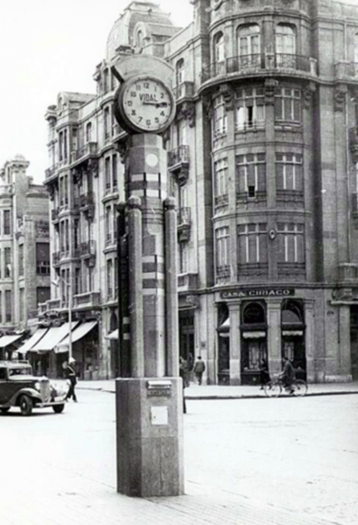 Veinticinco años después de su construcción, esta instantánea de Daniel Garay ganó uno de los más prestigiosos premios de fotografía a nivel nacional. El reloj, a parte de su portentosa columna y una perfecta esfera de cristal en cuyo interior descansaban las manecillas, también poseía otra de las grandes curiosidades que convirtieron a este estandarte en un gigante de nuestro recuerdo. En sus faldas ubicaron un buzón de correos. A decir por el pueblo, el único durante muchos años, que no estaba en las propias oficinas de Correos, la Estación del Norte o en las oficinas de telégrafos.