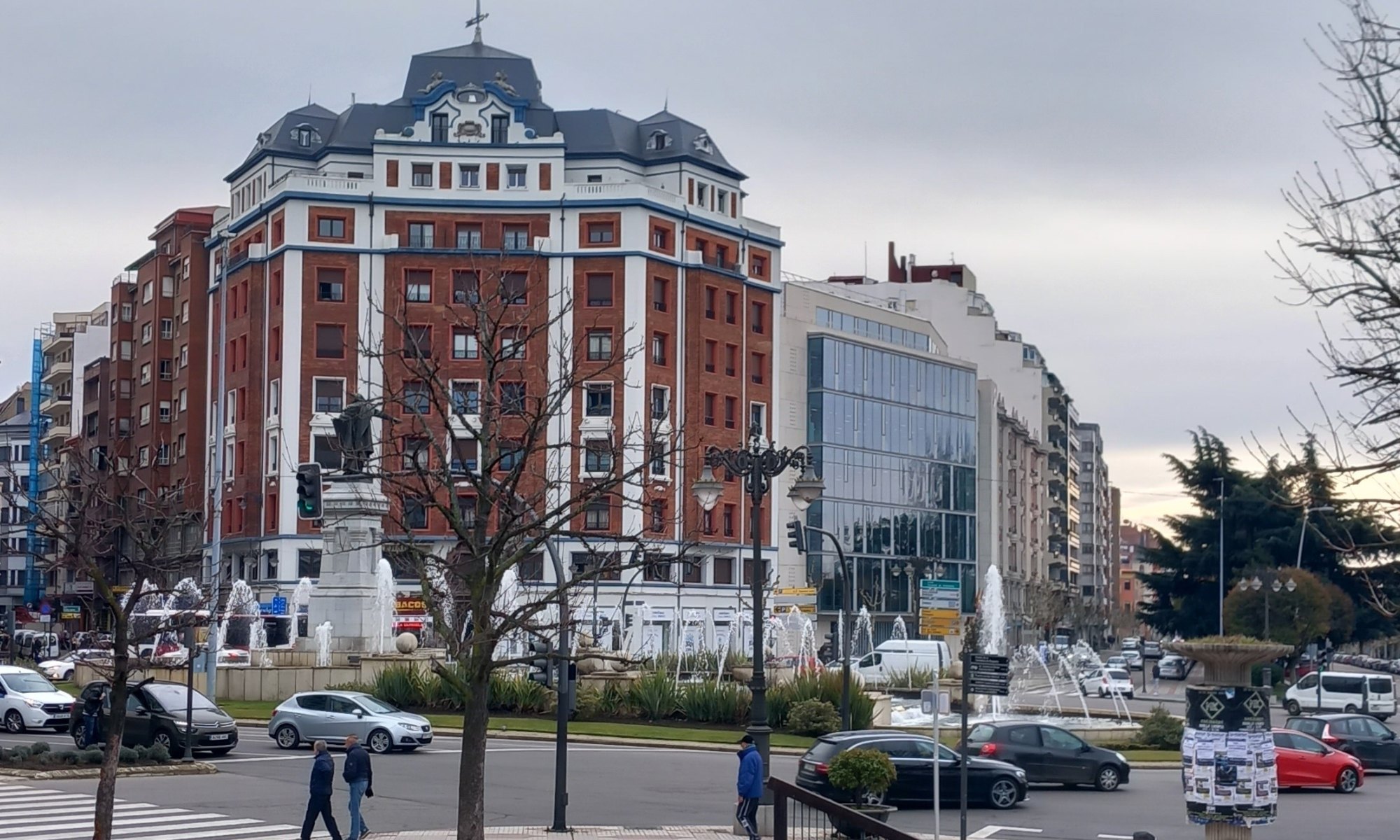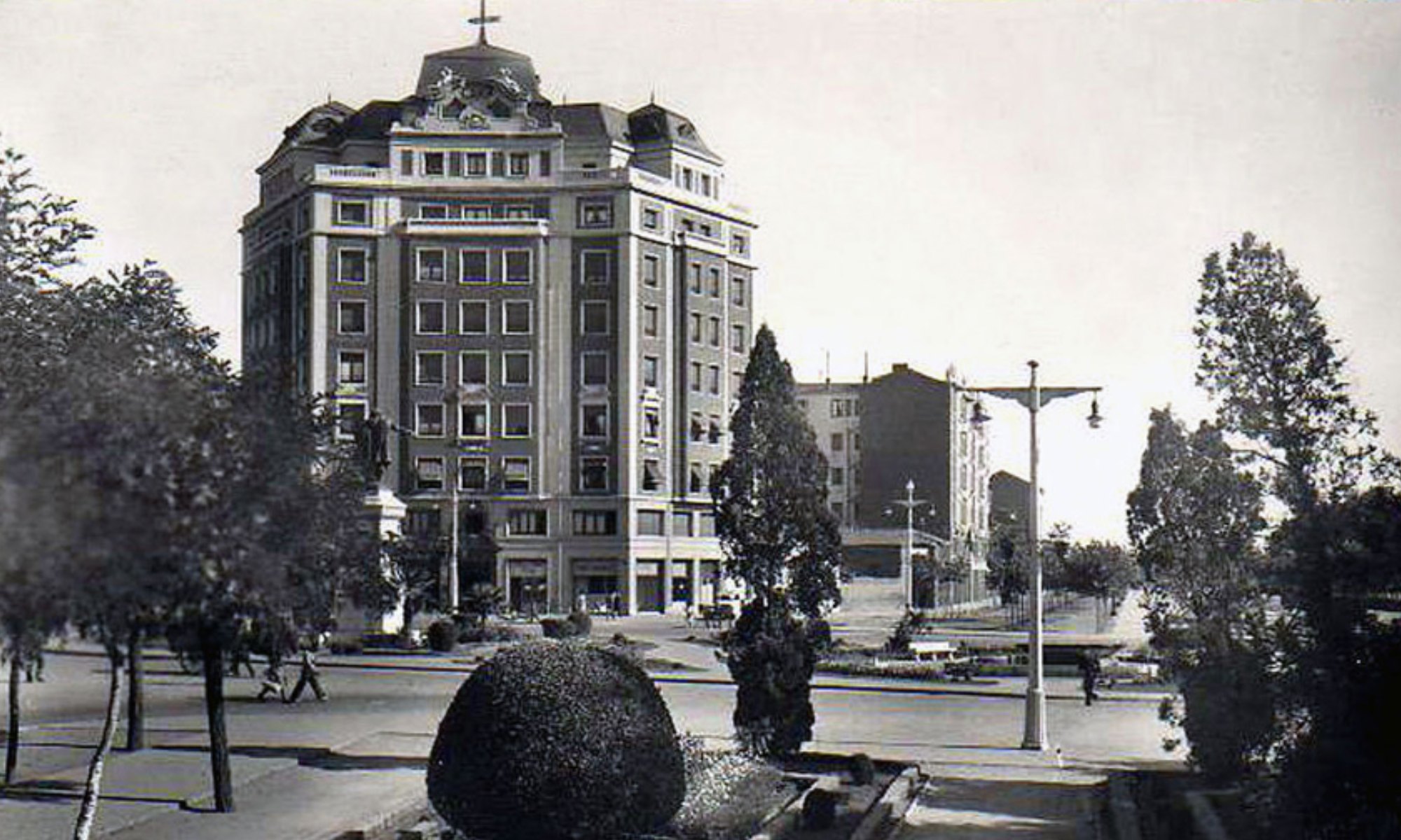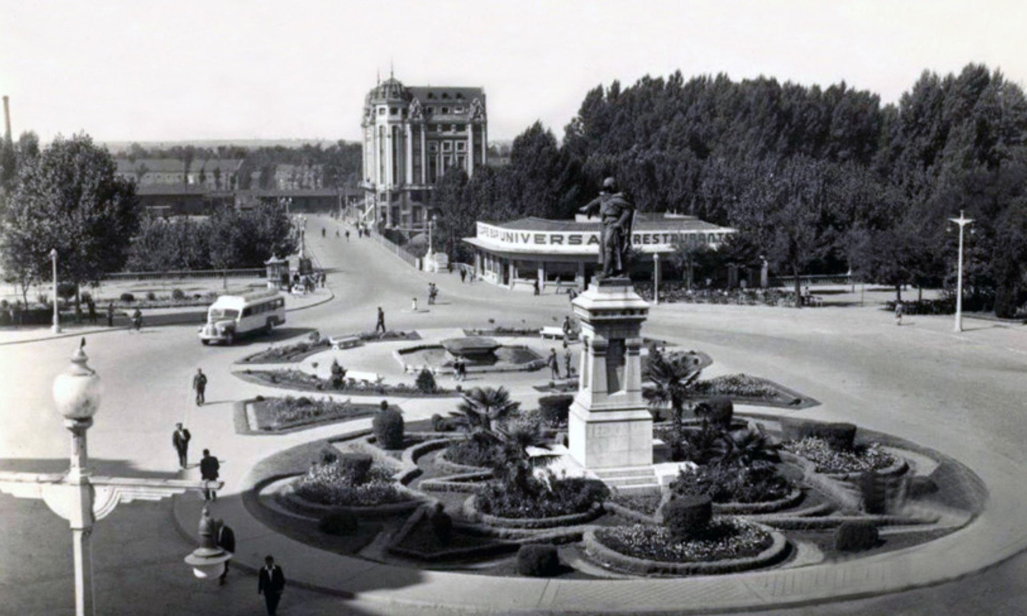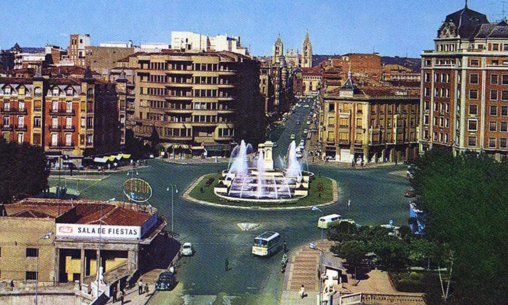 La plaza de Guzmán el Bueno, con sus fuentes, es la descendiente de varias primitivas, que fueron cambiando con el paso de los años. Esta instantánea, de 1956, nos recuerda la preciosa zona ovalada ajardinada por la que los viandantes circulaban, sin miedo a ser atropellados por los escasos coches de la ciudad. Vean ustedes, como este romántico Cicerone, aún siente predilección por la mímesis arquitectónica, pues le recuerda, esta estampa, a la plaza de la Concordia de la ciudad de París.