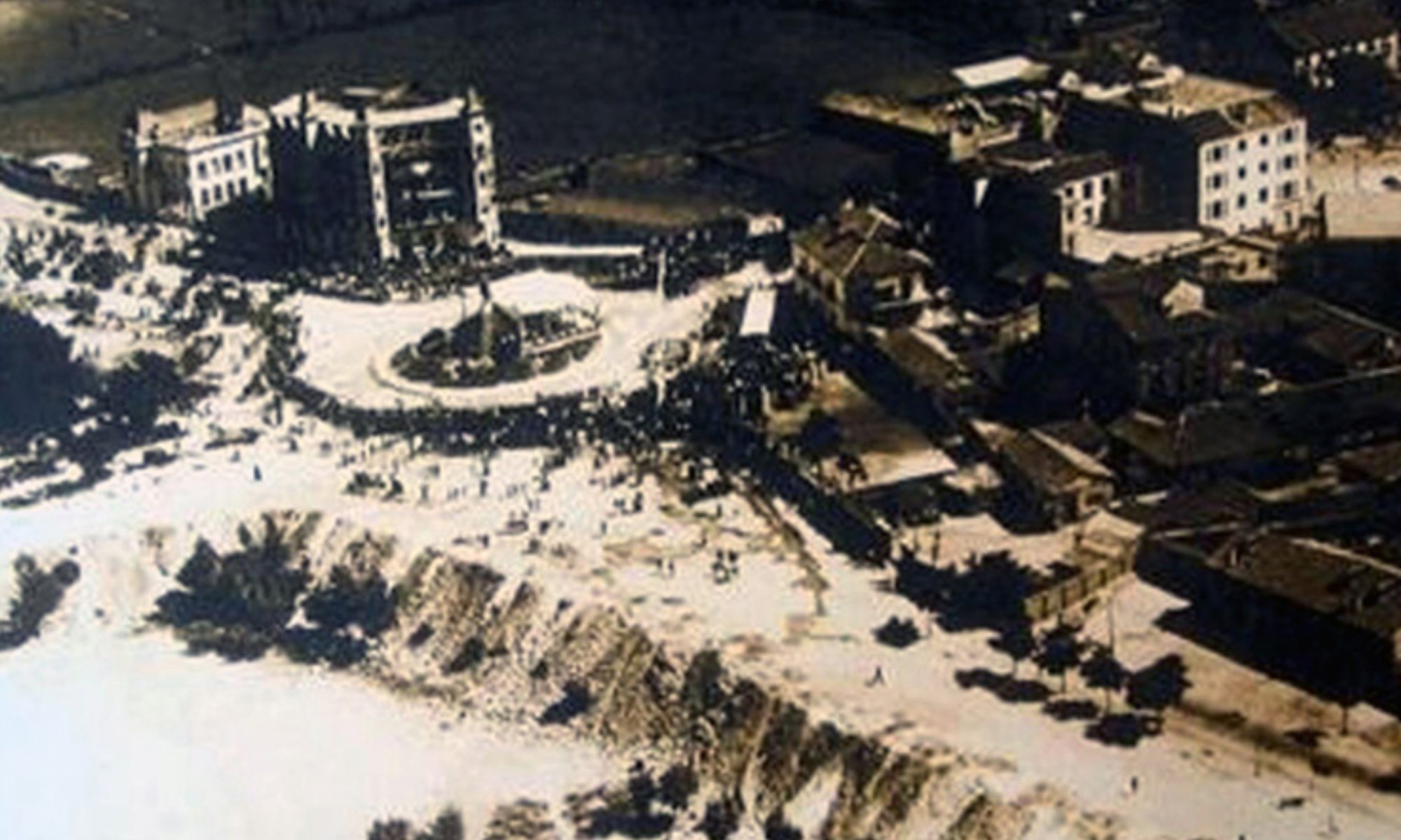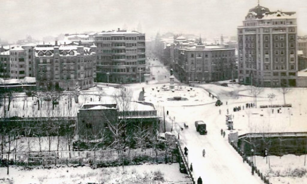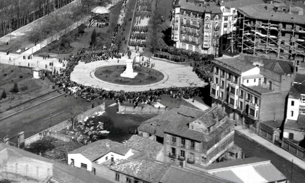 La Casa se levantó en 1946, tan solo unos años después del citado funeral, y aquí se puede ver, ya con sus vecinos eternos, el Sanatorio Miranda, y la Casa Arriola, cubierta de nieve durante la nevada de 1955. La Casa de los Picos, aún en pie, sería gran compañera de esta hasta su demolición en 1977.