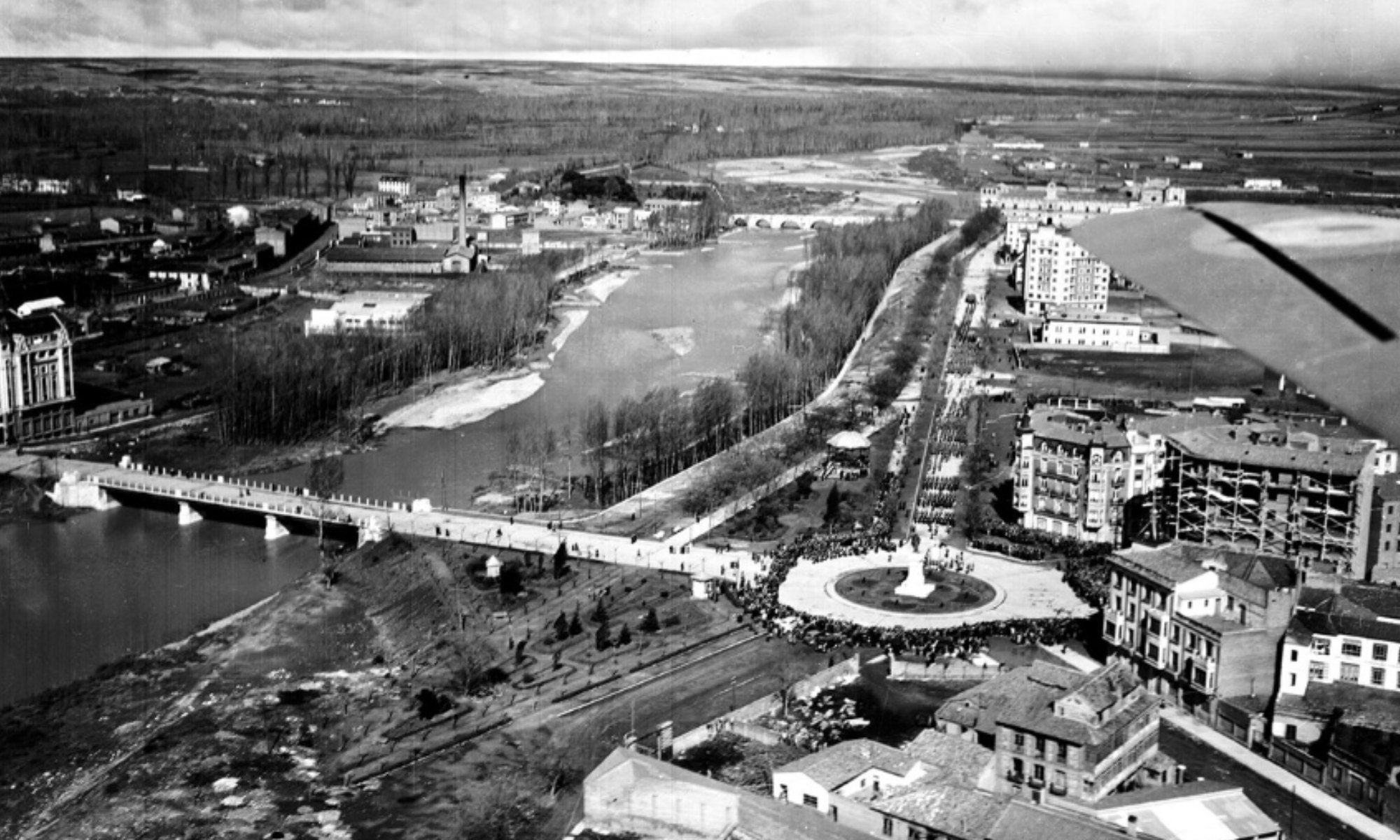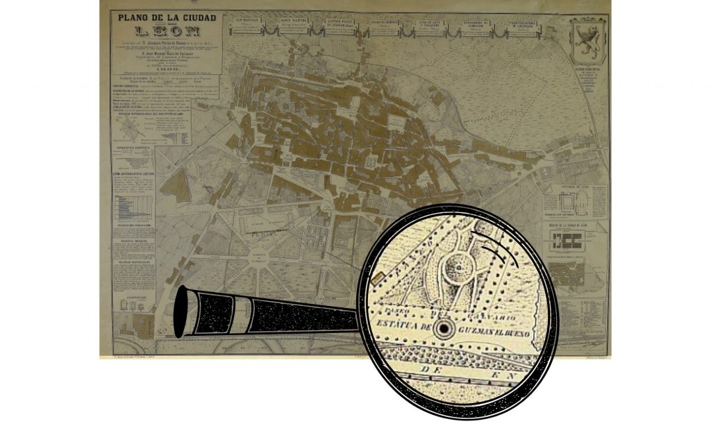 Pero algo ya se olían los leoneses, que representaron este punto, que les señalo con la brújula acusadora, en el que dibujaron la Estatua de Guzmán el Bueno. Ahora bien, nos apunta Javier, que muy conscientes de la ubicación de la estatua no eran, pues esa imagen corresponde al centro del paseo de Papalaguinda, donde ahora está el famoso Rectorado de la Universidad de León. Confundieron el lugar, pues diez años después, Guzmán el Bueno presidiría la plaza que comunica Ordoño II con Santo Domingo.