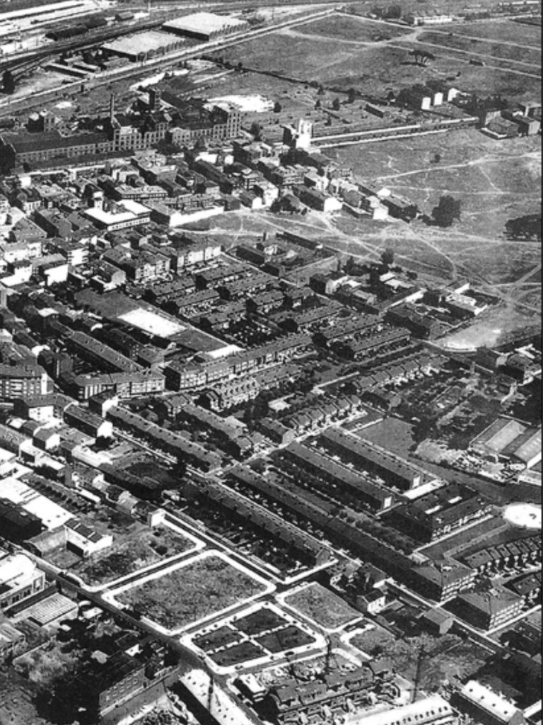 Desde esta perspectiva se observan los 3 bloques de viviendas en los que se desarrollaba la convivencia. Por desgracia, como se dijo ya, la fábrica aceptó varias de las condiciones impuestas por los sindicatos antes de que la Azucarera cerrase, pero no dieron su brazo a torcer; ni siquiera intentaron negociar la venta ni la cesión de las viviendas a los propios trabajadores. Durante años, se propuso que las casas fueran reconocidas como vivienda sociales, pero los dueños de los terrenos se negaron. Después de mucho tiempo en un estado paupérrimo, sus continuas okupaciones y la insalubridad que esa ubicación significaba para el barrio, pues era cual mingitorio al que uno iba a hacer sus necesidades, determinaron su derribo.