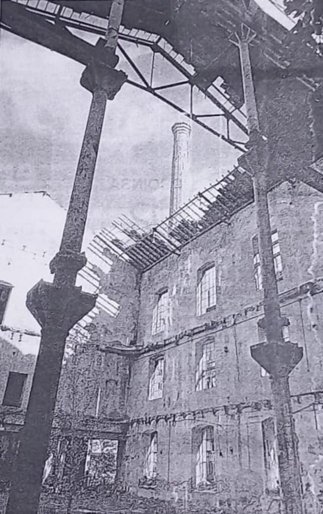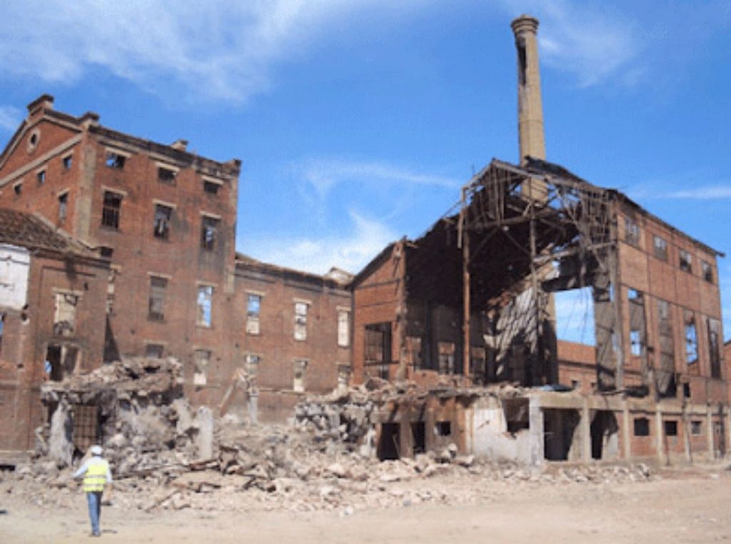 Este acto debilitó notablemente los cimientos, el suelo y las paredes de la azucarera. Las vigas de hierro fueron cortadas y vendidas y tan solo quedó un esqueleto inerte que fue asegurado años después. Como se ve en la siguiente fotografía, la chimenea principal se encontraba en tan mal estado tras años de abandono, que fue cortada y asegurada para evitar desprendimientos.