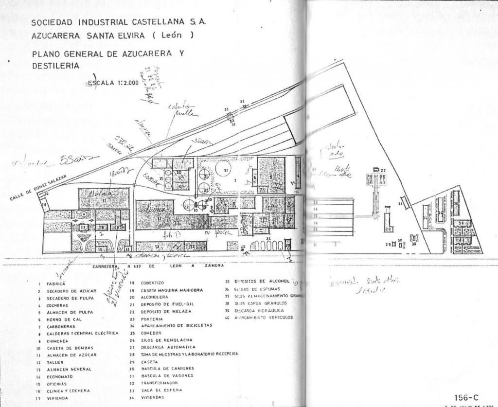 Aquí pueden observar, de nuevo de la mano del libro de Cony Salomón, la distribución de la gigantesca Azucarera Santa Elvira. Contemplando los planos, uno pudiera pensar que tiene similitudes con una gran ciudad, y eso es lo que piensa también este iluso Cicerone, que escuchando la narración de J. Carlos Aguilera, se imagina un idílico paraíso empresarial convertido en un familiar barrio. La Azucarera disponía de economato, de viviendas, de oficinas, de un parque, y era energéticamente autosuficiente (aunque durante la campaña precisaba de energía exterior). Los panaderos, los lecheros, los vendedores ambulantes, llegaban de igual manera a las viviendas de la azucarera para repartir a sus vecinos los productos necesarios para la cocina.
