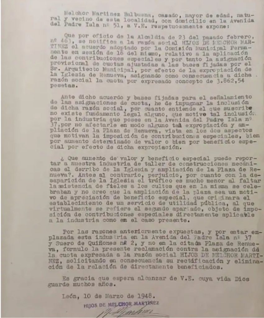 Por las razones anteriormente expuestas, y por estar emplaza esta industria en la avenida Padre Isla nº 37 y Suero de Quiñones nº2, y no en la citada plaza de Renueva, formulo la presente reclamación contra la asignación de la cuota expresada a la razón social HIJOS DE MELCHOR MARTÍNEZ, solicitando en consecuencia su rectificación y eliminando de la relación de directamente beneficiados.