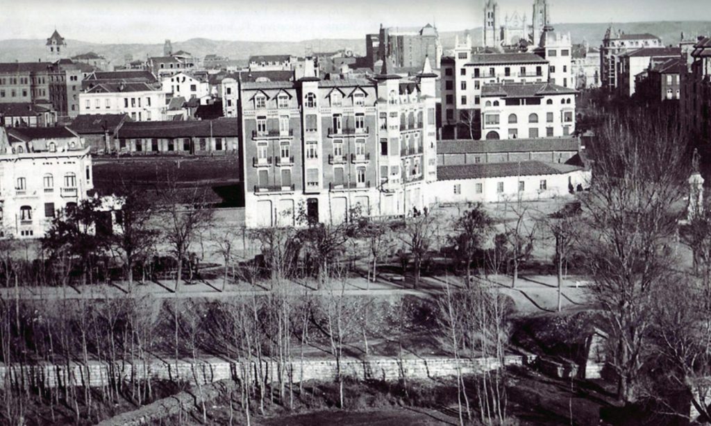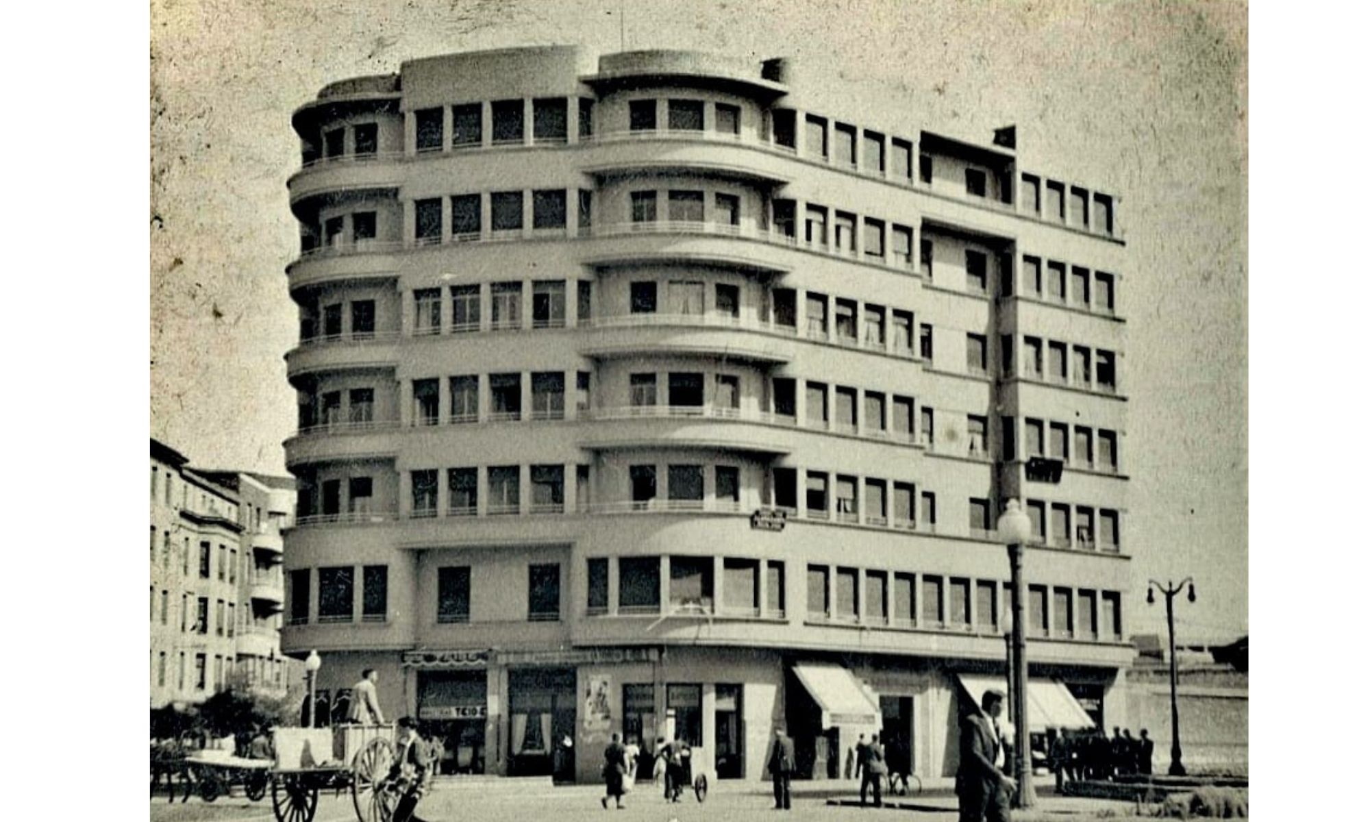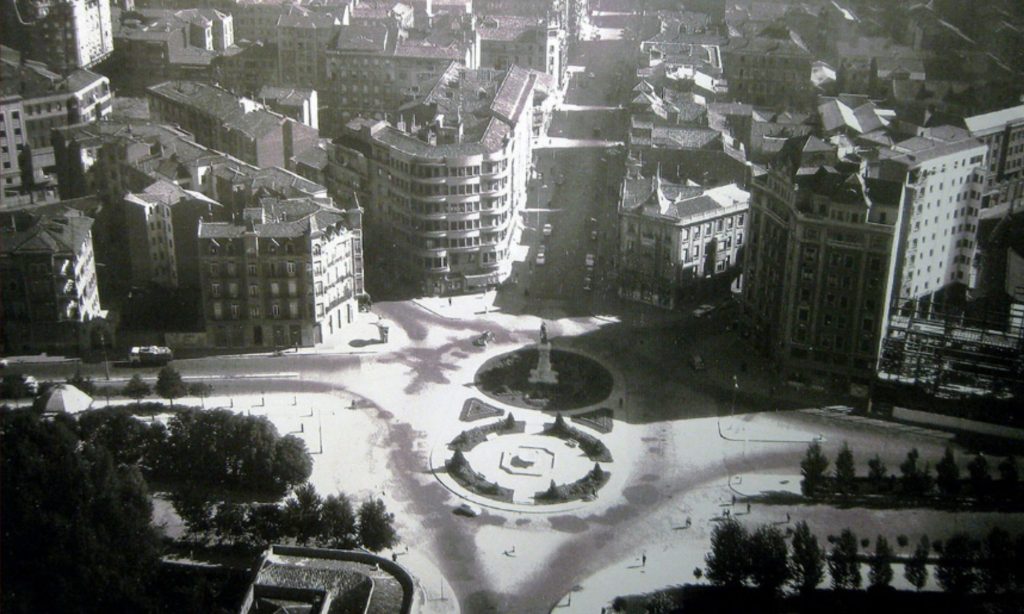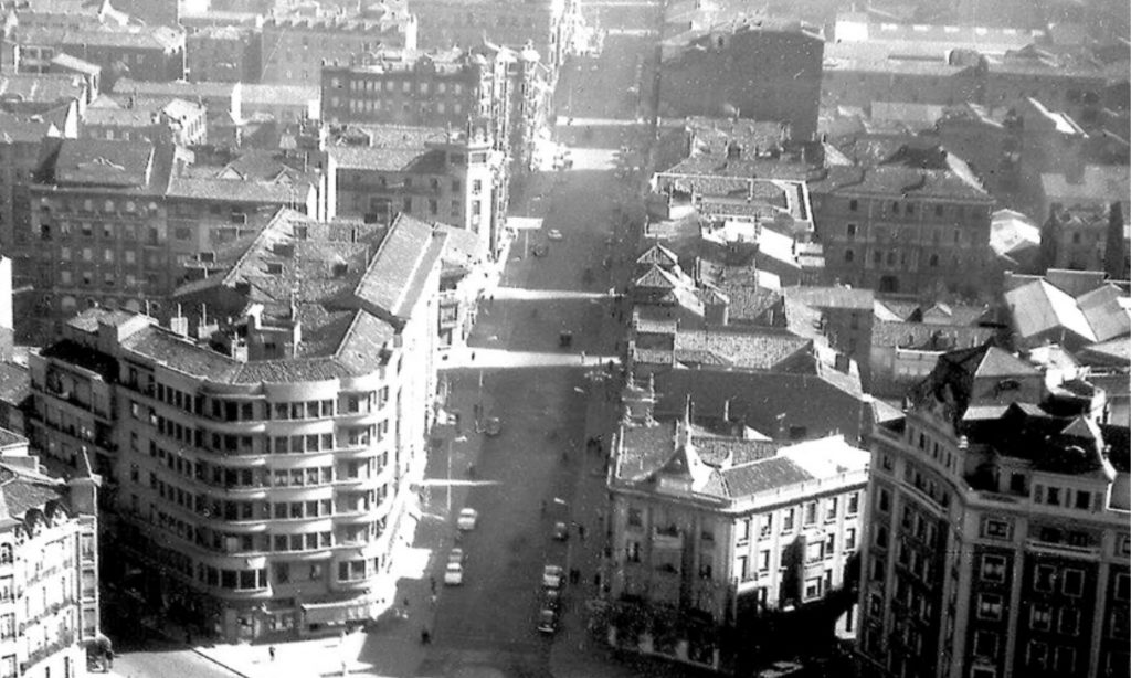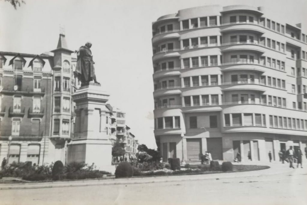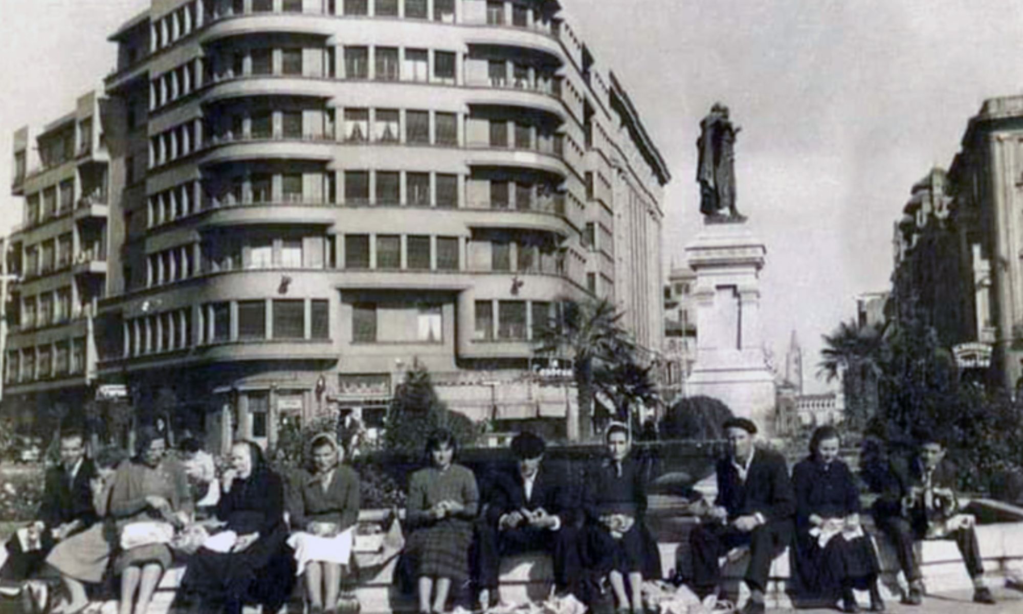 Una imagen de los años cuarenta nos permite contemplar el edificio aún en construcción, con su andamiaje alzándose sobre una Plaza de Guzmán el Bueno repleta de actividad. En primer plano, ciudadanos de la época disfrutan de un tentempié al pie de la estatua de Guzmán, sin sospechar que aquella construcción que crecía a sus espaldas pasaría a formar parte del paisaje urbano de la ciudad durante décadas.