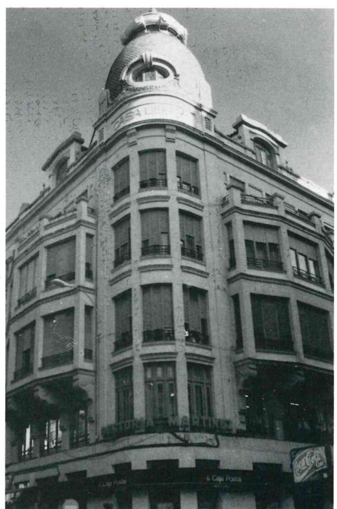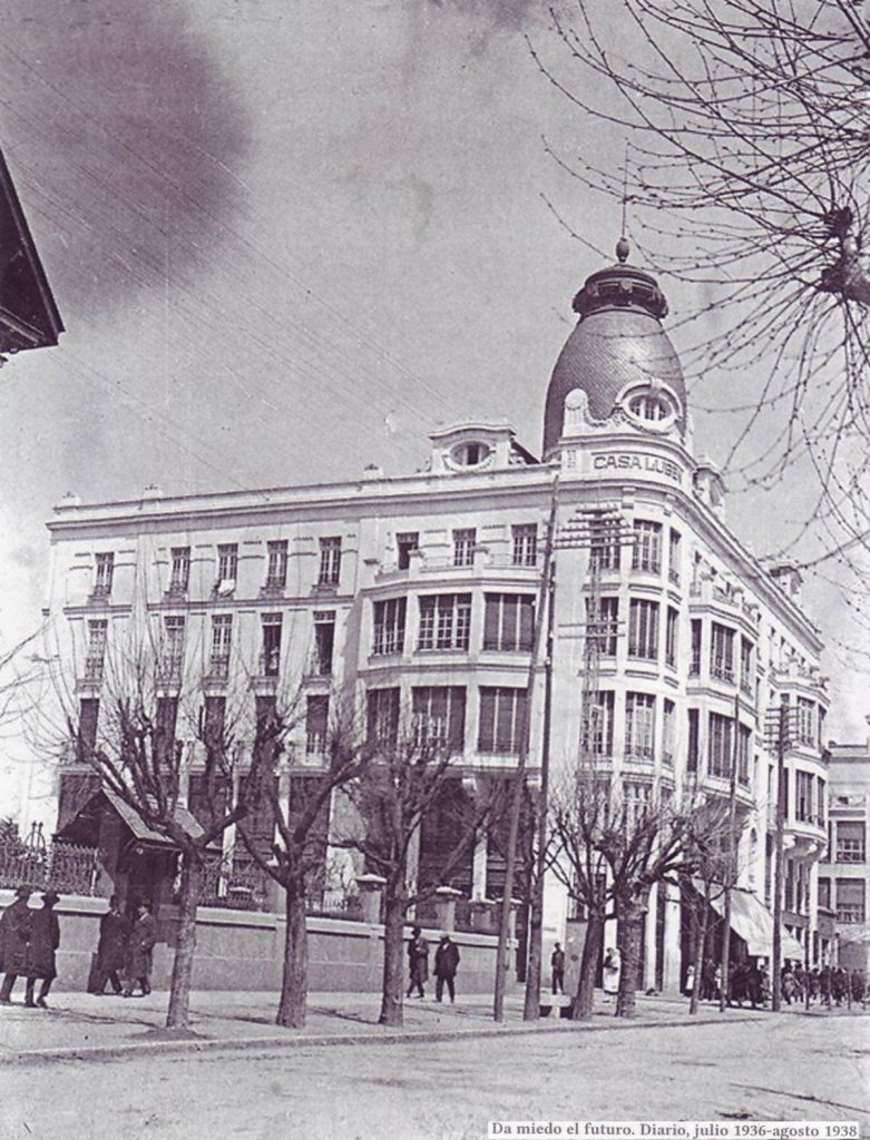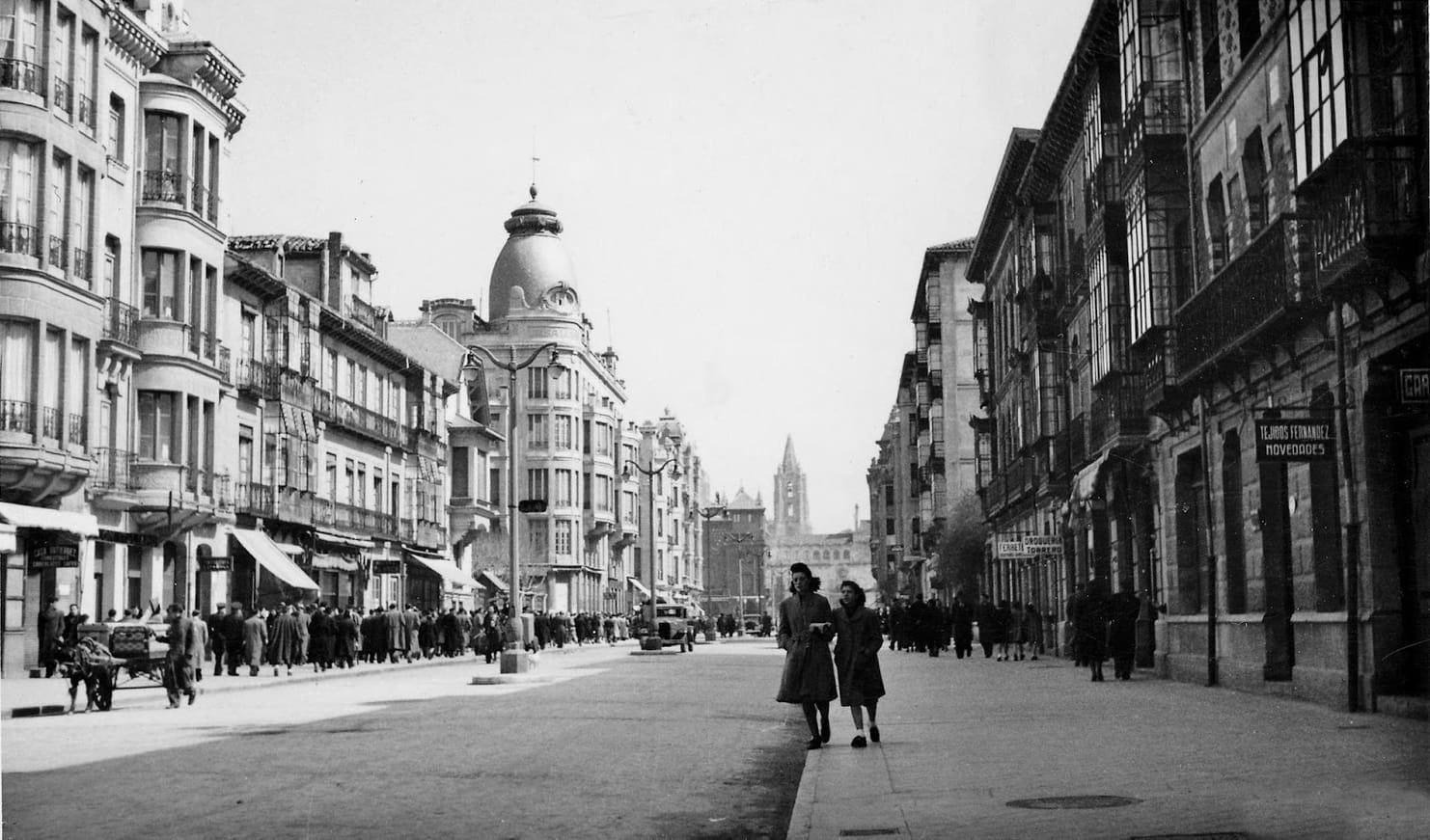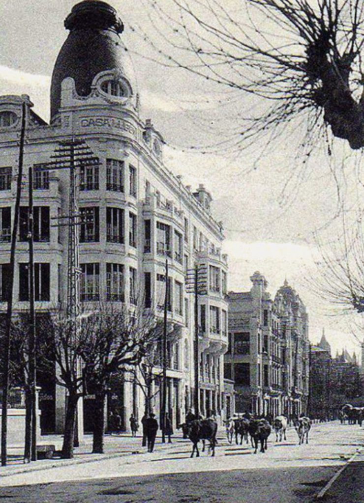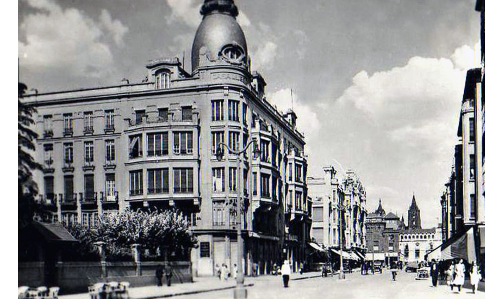 Incluso para la época de la fotografía, los años (ca.) 1930, ya observan ustedes un edificio famoso y emblemático que también sucumbió al paso del tiempo, como es la casa que hace esquina entre Ordoño II y Alcázar de Toledo. En él se pueden reconocer los 3 pisos de altura más las terminaciones que la dotan de 4. Pero, en la actualidad, si son perspicaces caminantes y pulcros detectives, descubrirán que hoy en día posee la misma fisonomía, pero en lugar de 3 pisos basales, posee ya 5 más la ya citada extensión hacia la sexta, duplicando su tamaño.