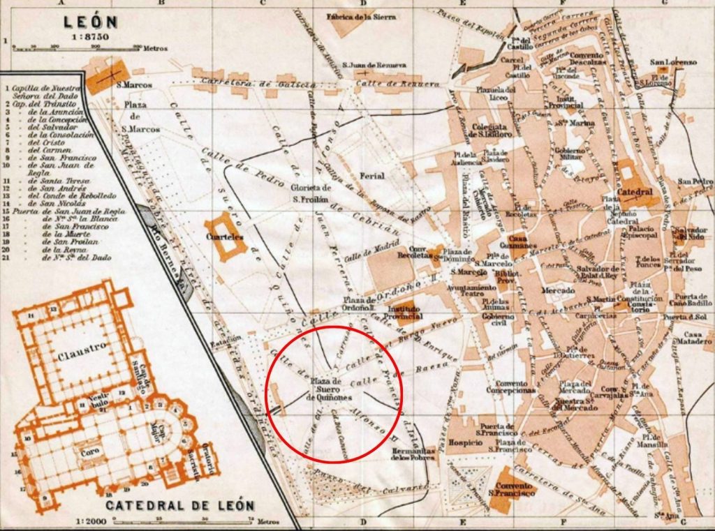 Es indudable reconocer que la plaza de la Pícara Justina representa uno de esos núcleos neurálgicos de la ciudad de León. En ella confluyen multitud de calles que la conectan con República Argentina, con Ordoño II e incluso con la Avenida Independencia. Lanzo un órdago a los lectores, que seguro que saben que la plaza llevó por nombre también la de don Cayo, pero que no sabían que fue bautizada, en algún momento, como plaza de Suero de Quiñones, desprendiéndose a su alrededor una avenida que cruzaba el centro de León, casi paralela a Condesa Sagasta. Si alguien conoce el origen de este nombre diferente, que observan en el mapa datado en 1915, leo sus teorías en comentarios.