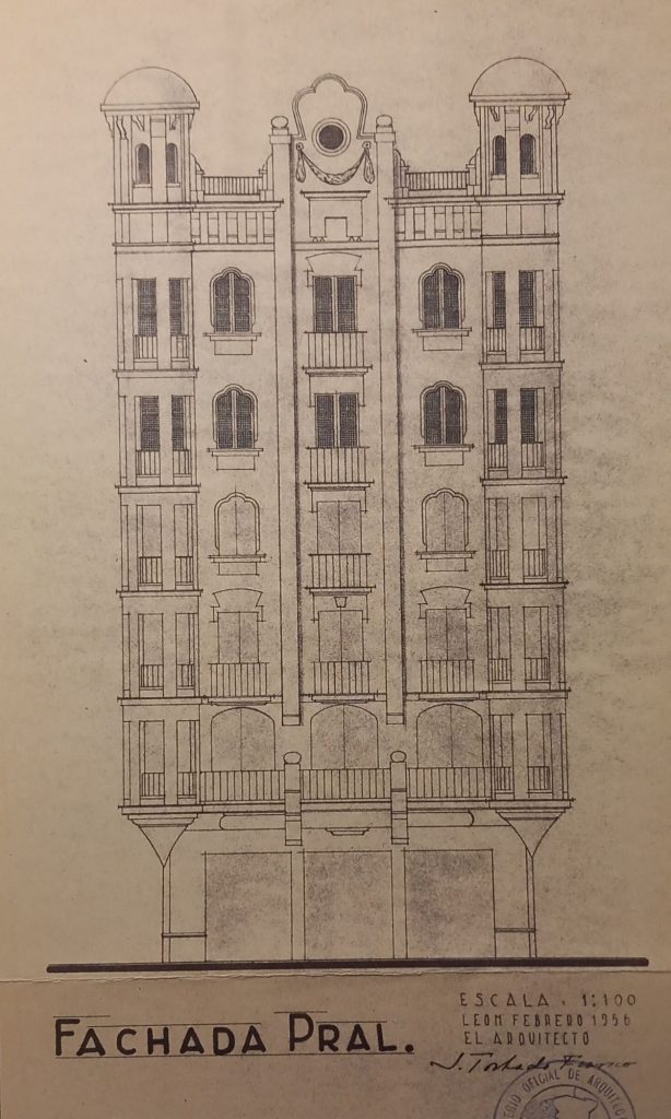 Pero regresemos al enigma arquitectónico que nos ocupa: ¿por qué se elevaron dos pisos más en la Casa Alfageme? En 1956, la familia vendió el edificio a Joaquín Blanco con una única condición: las cuatro hijas y el hijo de Isidro Alfageme, Santiago, podrían continuar residiendo en sus hogares mediante una renta simbólica hasta el fallecimiento de los progenitores. Ante esta situación, Joaquín Blanco ideó una solución ingeniosa para rentabilizar su inversión sin despojar a la familia de su hogar: optó por la ampliación vertical, diseñando un proyecto arquitectónico que respetaba la esencia original del edificio y, a la vez, le confería una verticalidad inusitada. Así, las torrecillas fueron elevadas dos pisos más, logrando una armonía visual que evitó cualquier desentonación con la estructura preexistente. Cualquiera que se hubiera ausentado de León durante un par de años habría tenido la impresión de que el edificio siempre había sido así.