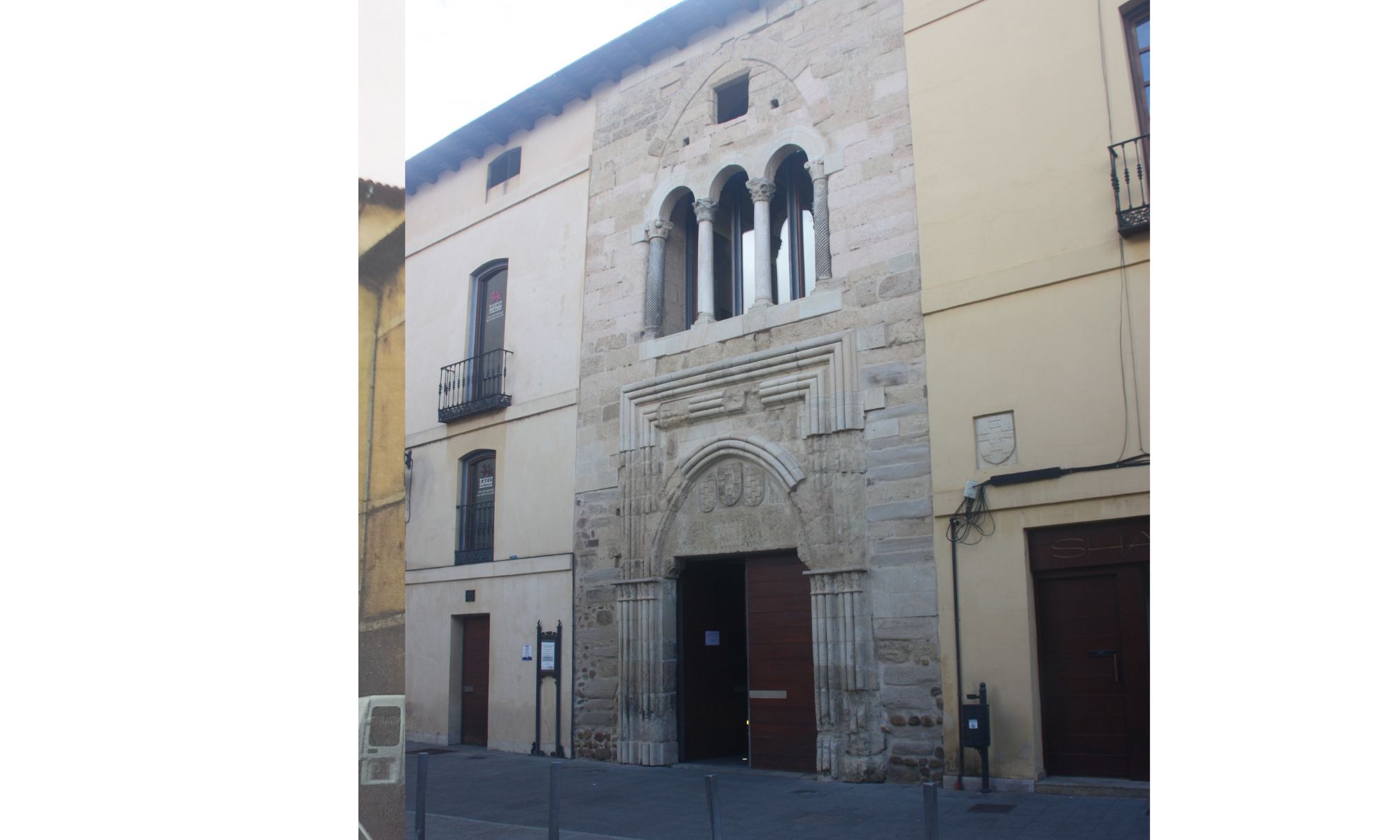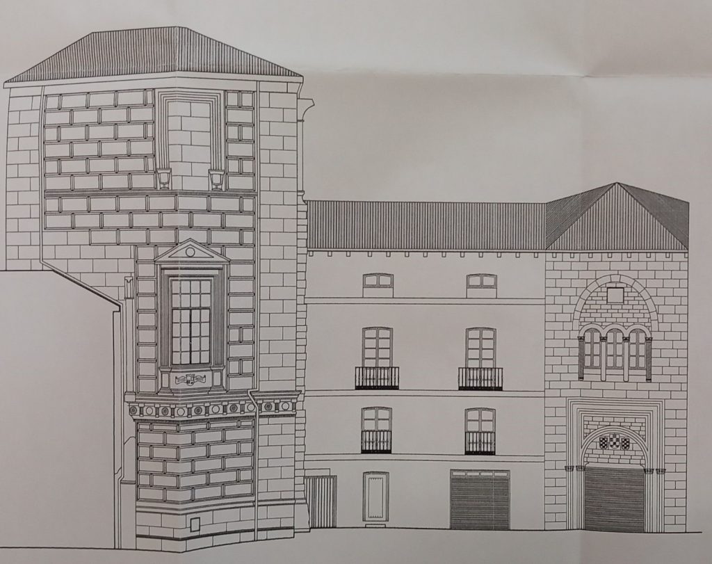 Como habrán ya visto en los planos confeccionados por Torres, del Palacio original apenas se conserva la estructura central de la fachada y un torreón renacentista que está datado en el siglo XVI. La heráldica del conjunto es muy clara en cuanto a su origen. El escudo de los Quiñones, que ocupa el centro del pórtico, y dos de la familia Bazán, cada uno a un lado del anterior, sobre un balcón llamativo con columnas del estilo ramirense. Estos dos escudos citados pertenecen, como bien hemos apuntado, a la familia Bazán, pues es Juana González de Bazán quien contrajera nupcias con Suero de Quiñones.