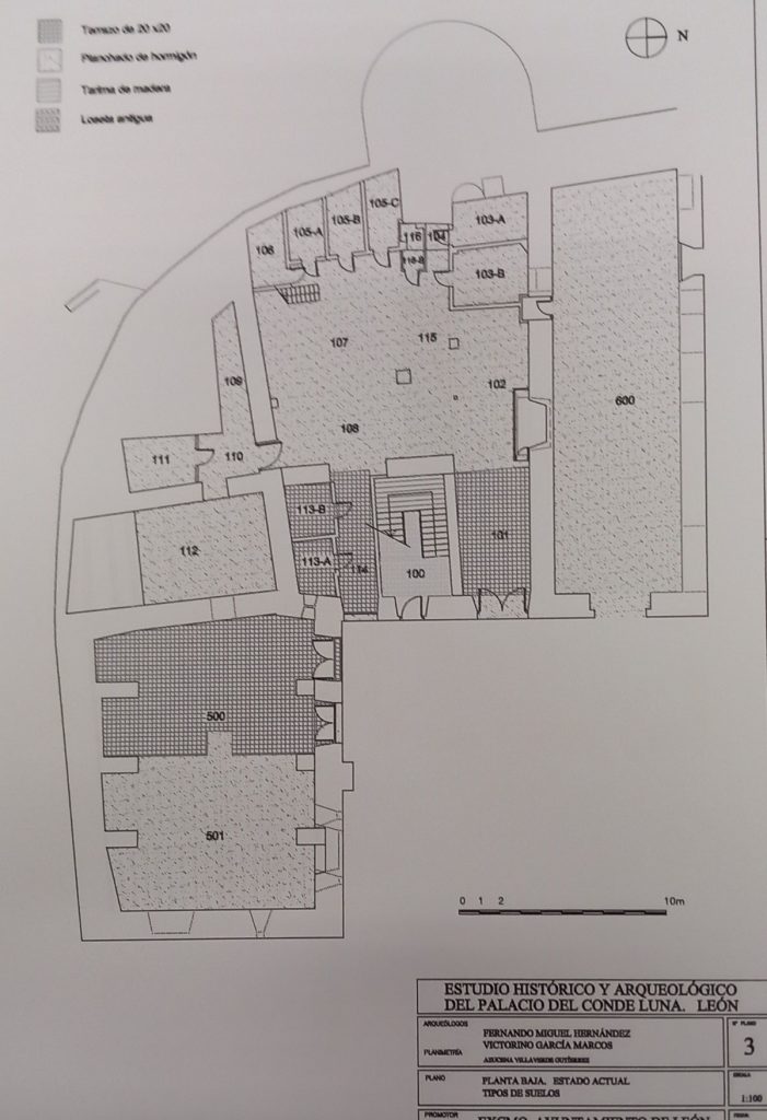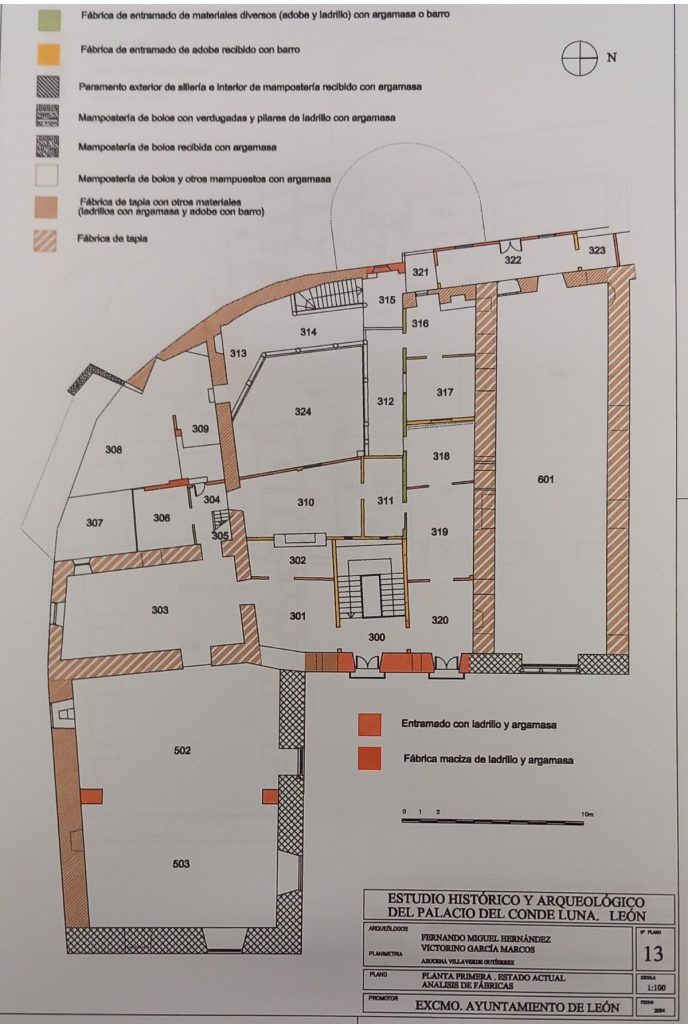 Les pediré un poco de esfuerzo en cuanto a la visión espacial, pues nos encontramos en una zona urbanísticamente muy curiosa. El Palacio de los condes de Luna ocupa uno de los recodos de la muralla romana original, en su interior, por lo que se han hallado, en varias prospecciones, restos de alto valor histórico que datan de la primera construcción de León. También se observa, de la época medieval, un sistema constructivo de doble aparejo de mampostería, de cantos rodados y relleno el espacio anterior con calicostro de piedras de menores dimensiones. Corresponde al periodo del siglo XVI. El compendio de las excavaciones realizadas por Fernando Miguel entre 1987 y 1996 se encuentran recopiladas en el libro Palat del Rey de Margarita Torres, y en la memoria de obra localizada en el Archivo Municipal que con gusto me acercaron Cintia y Magín.