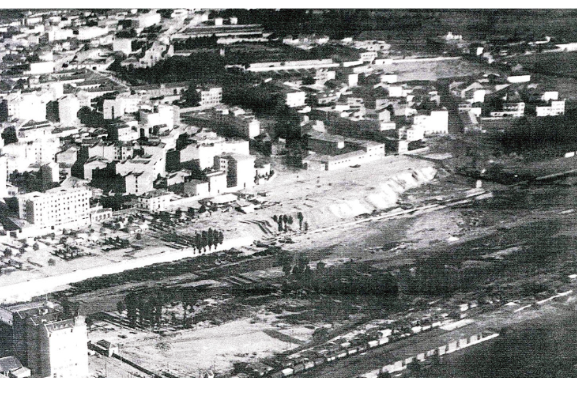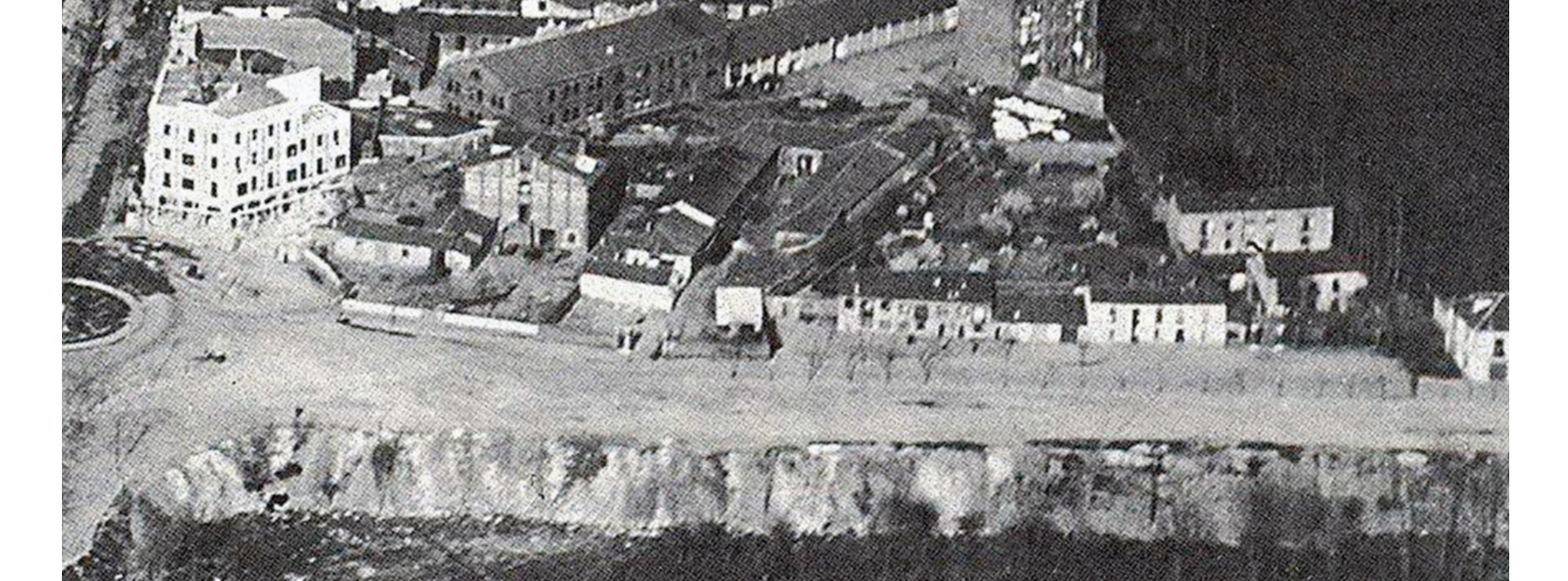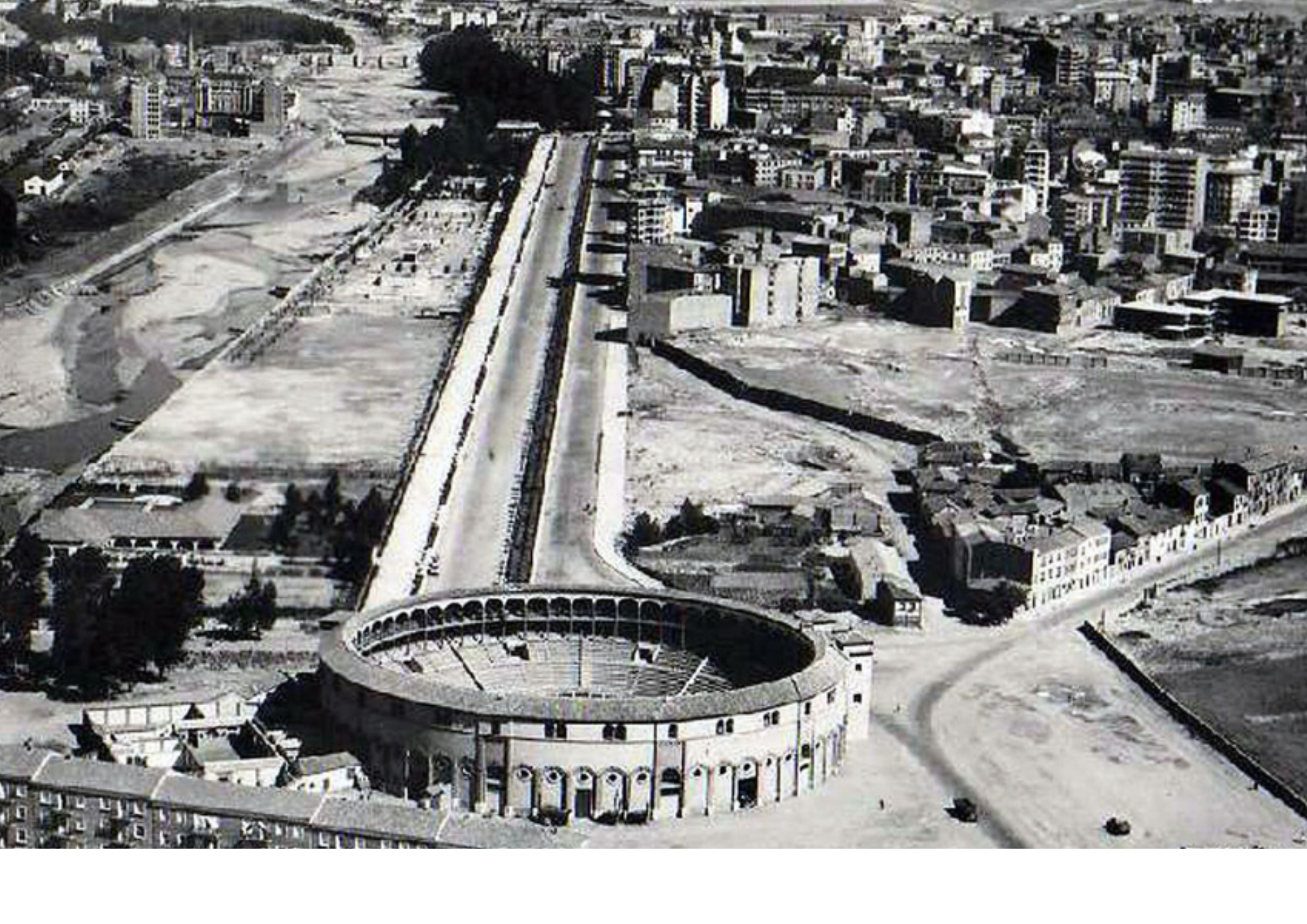 Desde el cielo, la visión ya es muy diferente. Para cuando 1950 arribó, la Plaza de Toros ya gozaba de lleno absoluto en todas sus funciones y Papalaguinda ya poseía una estructura bien consolidada. Como ven, la carretera principal ya conectaba ambas plazas, y el parque, aledaño al río, se desarrollaba con lento pero seguro avance.
