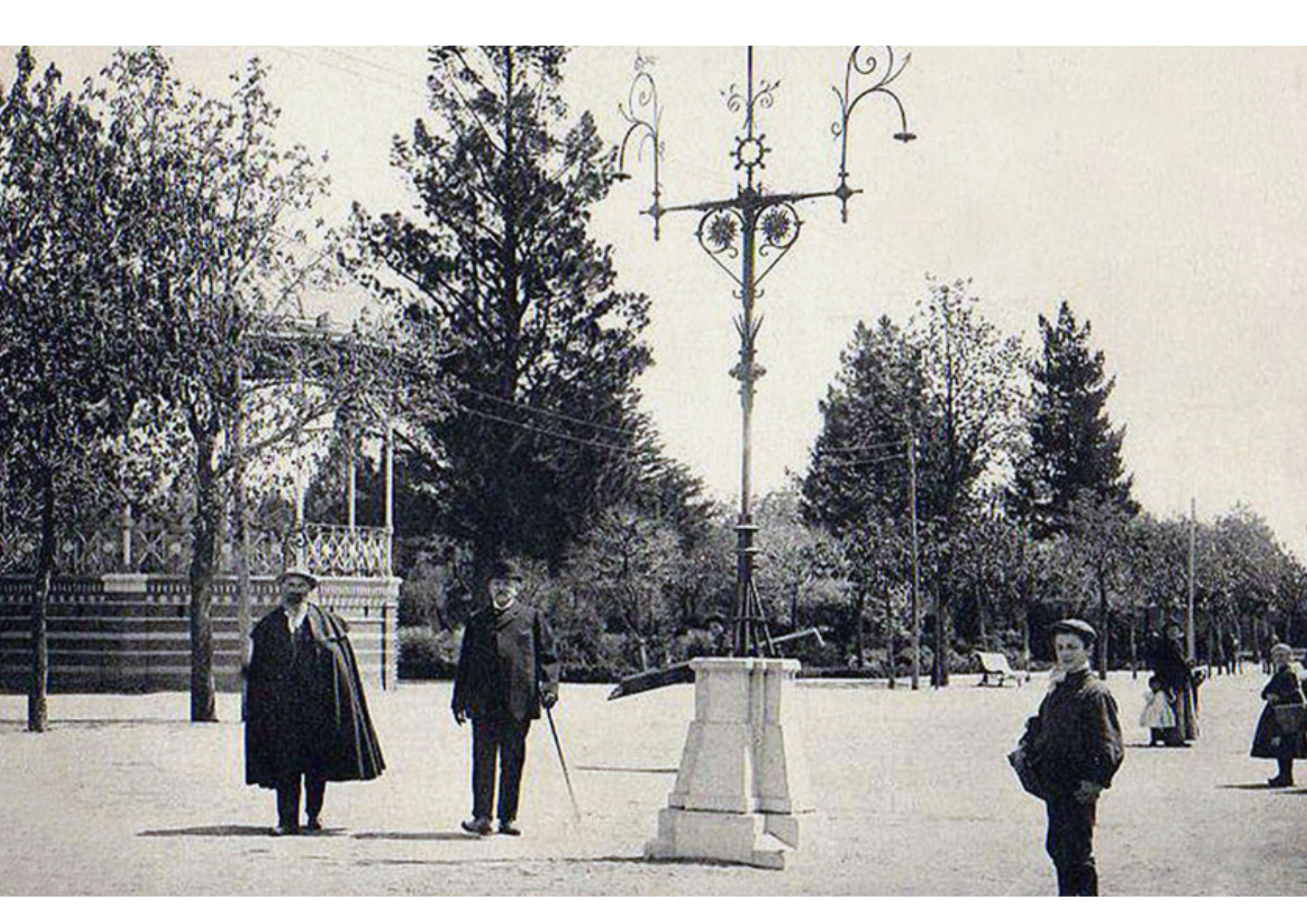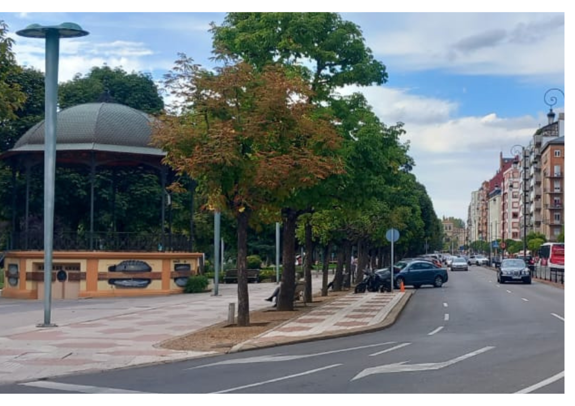 El Cicerone, caracterizado por buscar el origen de los odónimos, o los nombres de las calles de León, persigue la verdad y se topa con instantáneas tan hermosas como la siguiente, realizada desde la plaza de Guzmán y ofreciéndonos la visión de un grupo de viandantes que han quedado atrapados por el papel químico en el que su recuerdo queda impregnado. Esta calle, que bien podría ser una avenida parisina durante el desarrollo de la corriente postimpresionista, no es más que el Paseo de Papalaguinda y el Paseo de la Condesa. Pero, olvidándonos un momento de los personajes, hay una construcción que llama nuestra atención: el templete de los músicos.