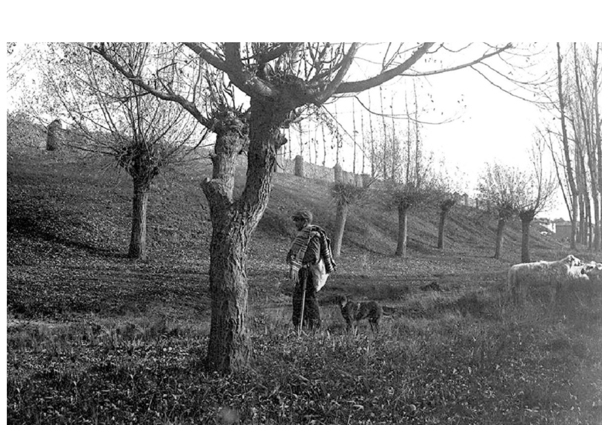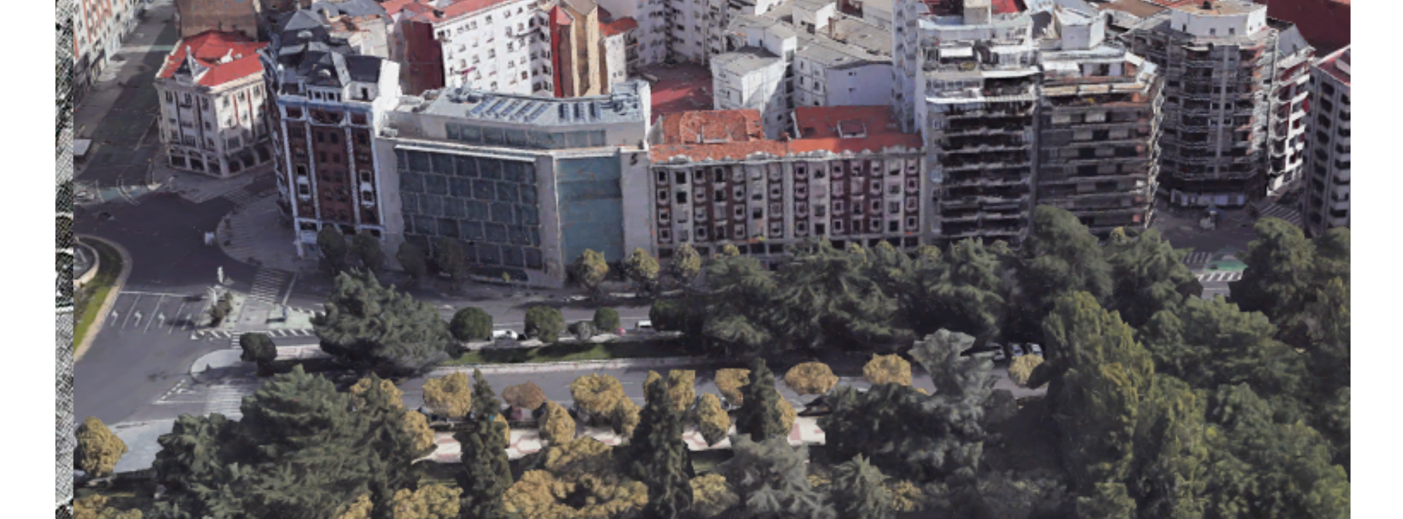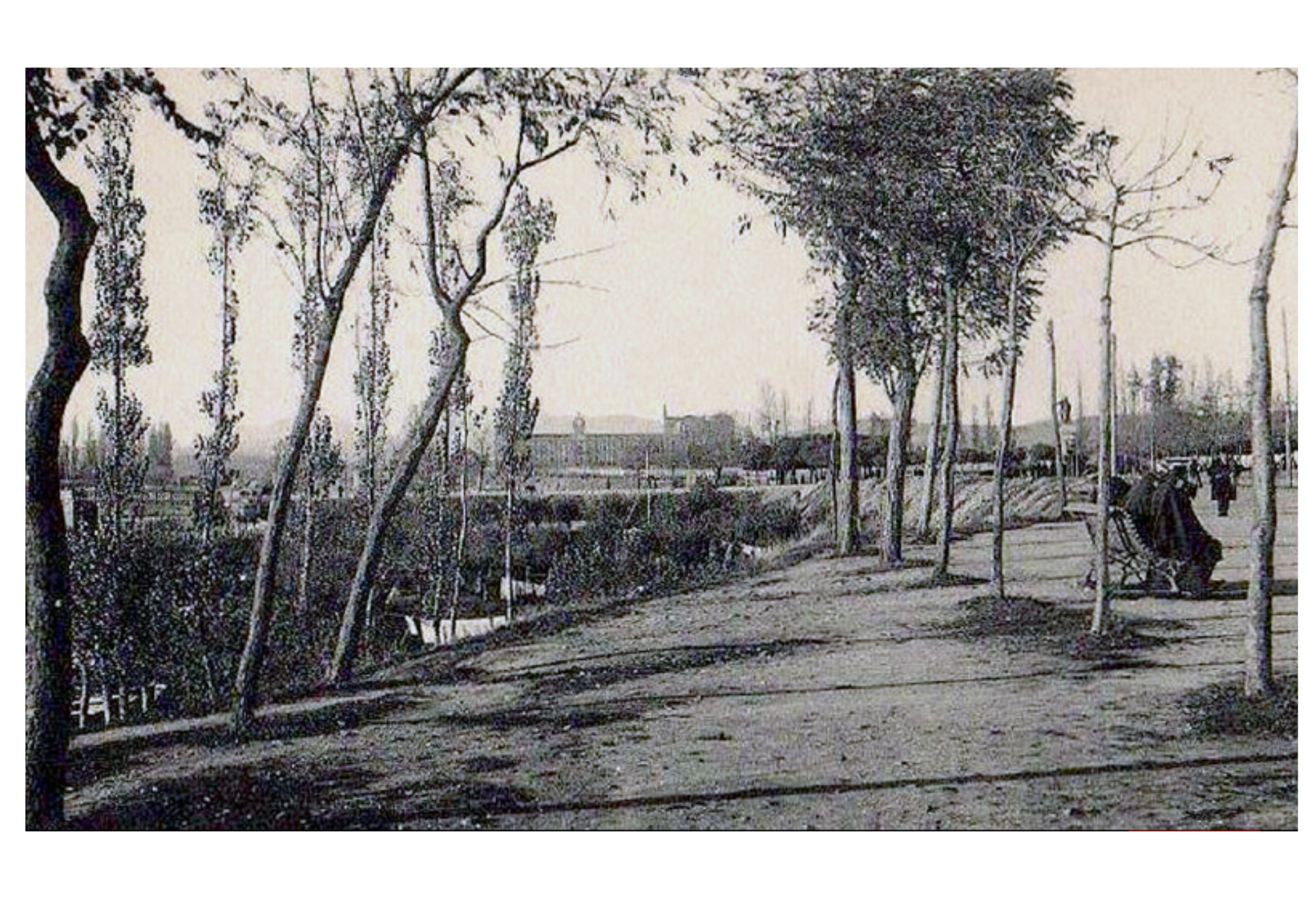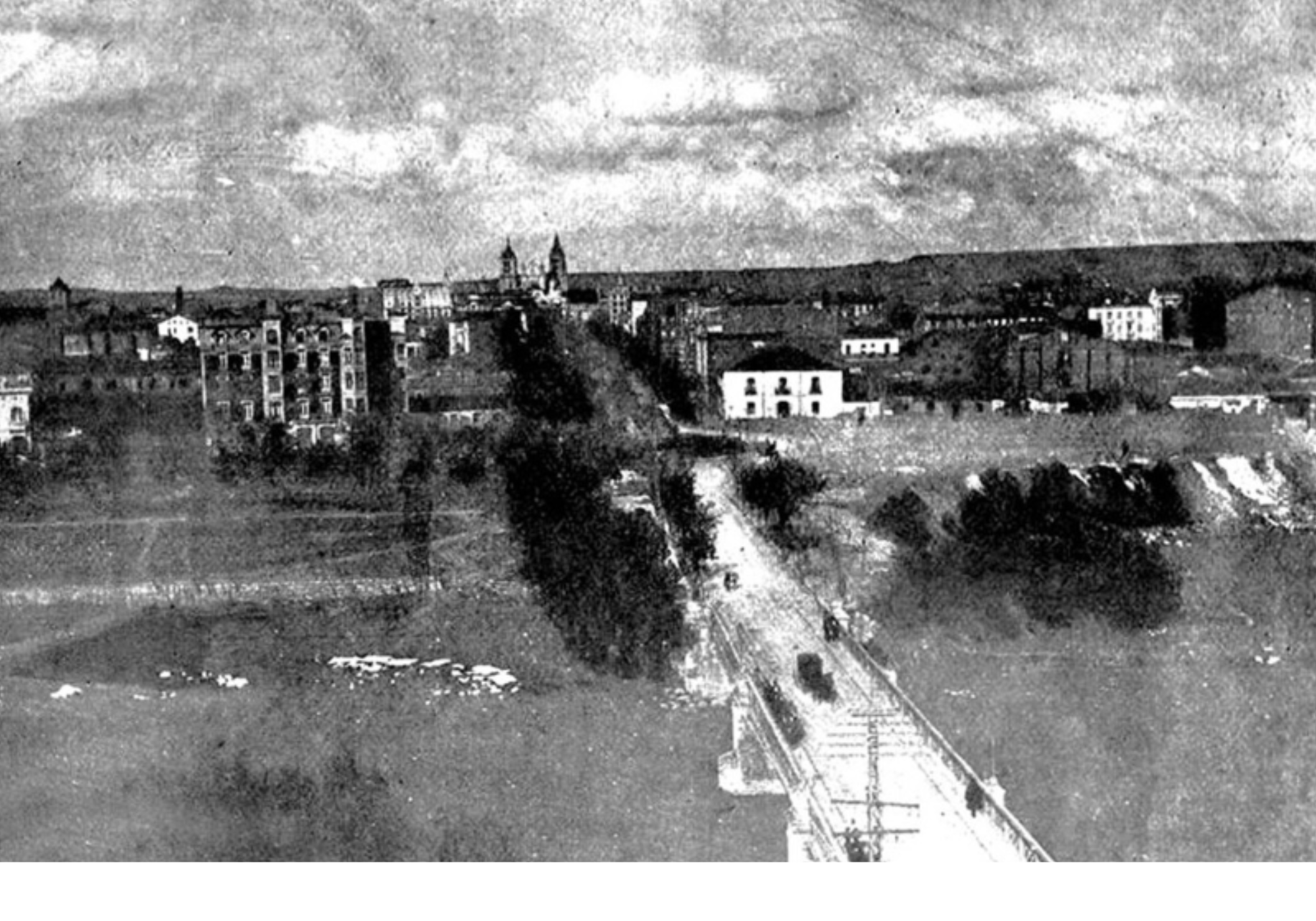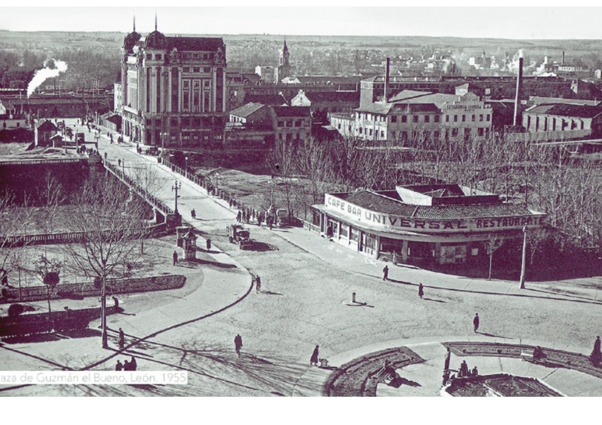 Como si la fotografía estuviera tomada desde la casa de don Valentín (aunque hubiera de esperar el fotógrafo a su construcción pues aún faltaban casi veinte años para que se levantase), la instantánea nos ofrece una preciosa postal sobre Guzmán el Bueno, de cuya plaza se desprenden 3 avenidas principales que son, Ordoño II (o el Paseo de las Negrillas entonces) hasta su unión con Santo Domingo (Plaza de la Libertad). Hacia la izquierda nace de ella el paseo de la Condesa de Sagasta y hacia la derecha el Paseo de Papalaguinda, asediado por la vegetación, por el desbroce de árboles y por abandonada visión de un barranco que conecta con directamente con uno de los ríos de León.