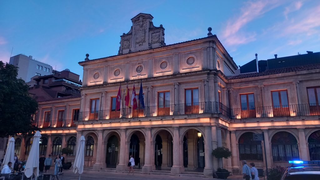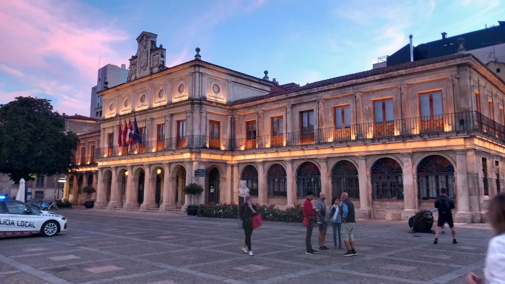 Adosado a este gran inmueble clásico y barroco que observan como frontispicio de lo que un día fue el Teatro Principal, se encuentra la Casa de la Poridad, o el recodo que une el centro arquitectónico con la casa de la Imprenta Moderna. Este edificio, aún en tan buen estado de conservación, data del año 1548 y fue proyectado por ilustre Juan del Ribero Rada. Aprovechando la demolición del Teatro Principal y el proyecto, se planificó una restauración, que luego hubo de dotar al edificio del prez que merece. Su magnificencia es digna del orgullo patrio en el que tiempo atrás se desarrollaron las actividades propias de alcaldía, pues fue sede del Ayuntamiento, pero hoy, resalta en su tejado un hueco, que en otra vida pasada (antes de 1966) era ocupado por un elemento arquitectónico, y casi heráldico que fue colocado en otro lugar. ¿Sabrían ustedes decirme de qué se trata? ¿Y si les dijera que de ese elemento hay una copia exacta en el centro de la Avenida Ordoño II, como homenaje al traslado del Ayuntamiento?