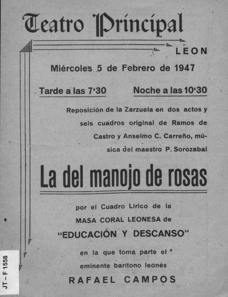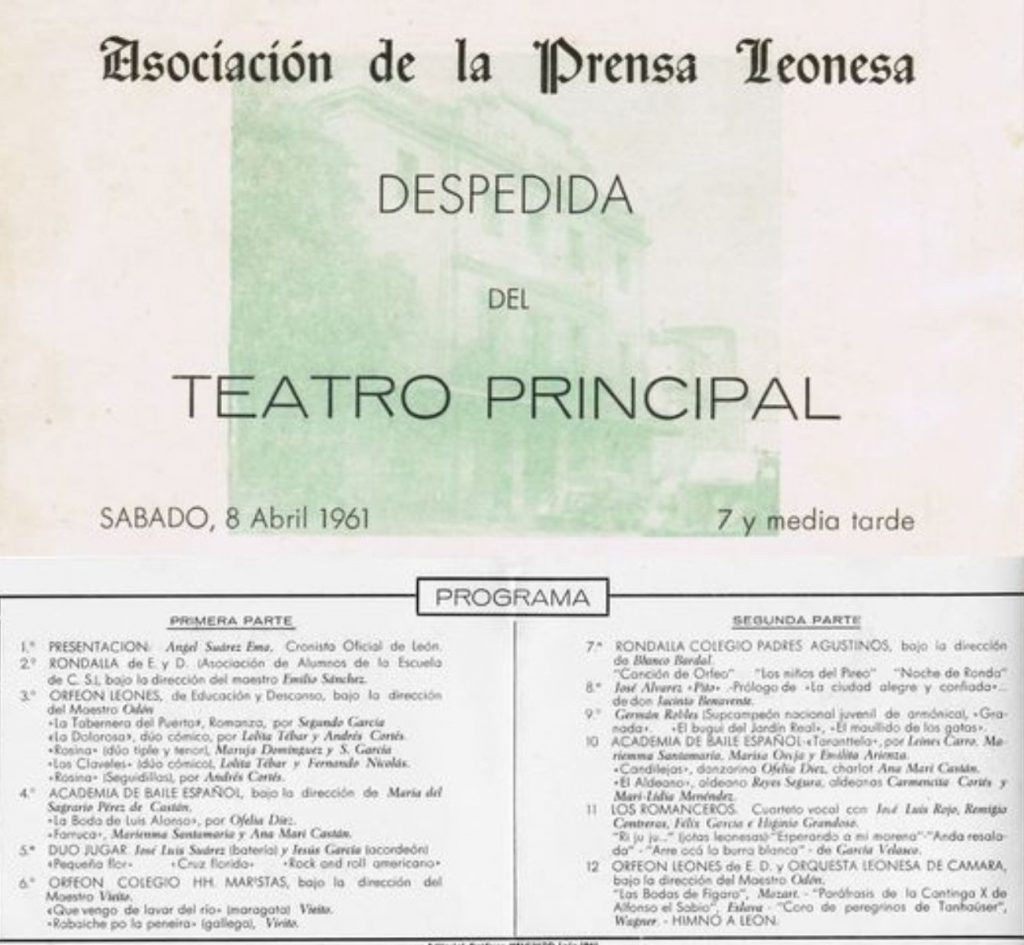 Este Teatro fue el primero que tuvo nuestra ciudad, llegando a competir con el Teatro Alfageme, fundado por un familiar de nuestro entrevistado, Rafael, quien nos ayudase a encontrar sentido a unas fotografías centenarias descubiertas por nuestro buen amigo y lector, Pedro. Pero parece que el Teatro Alfageme era más sala de cine que de comedias, por lo que durante varias décadas, los leoneses acudieron al Teatro Principal para disfrutar de las representaciones típicas de la época, como la zarzuela del Manojo de Rosas (ya saben: hace tiempo que vengo al taller y no sé a qué vengo…). La modernidad llegó al Teatro pocos años después, cuando en 1860 y, según las crónicas de Armando G. Colino, se instalaron unas nuevas y majestuosas butacas que saldrían después a subasta, una vez el Teatro Principal fuera derribado. Hay todavía registro de la subasta de esas sillas, y si alguno de ustedes consiguió hacerse con una de aquellas, de las que en su respaldo venían talladas las siglas T.P., puede considerarse un auténtico privilegiado, pues puede sentarse sobre un fragmento de la historia.